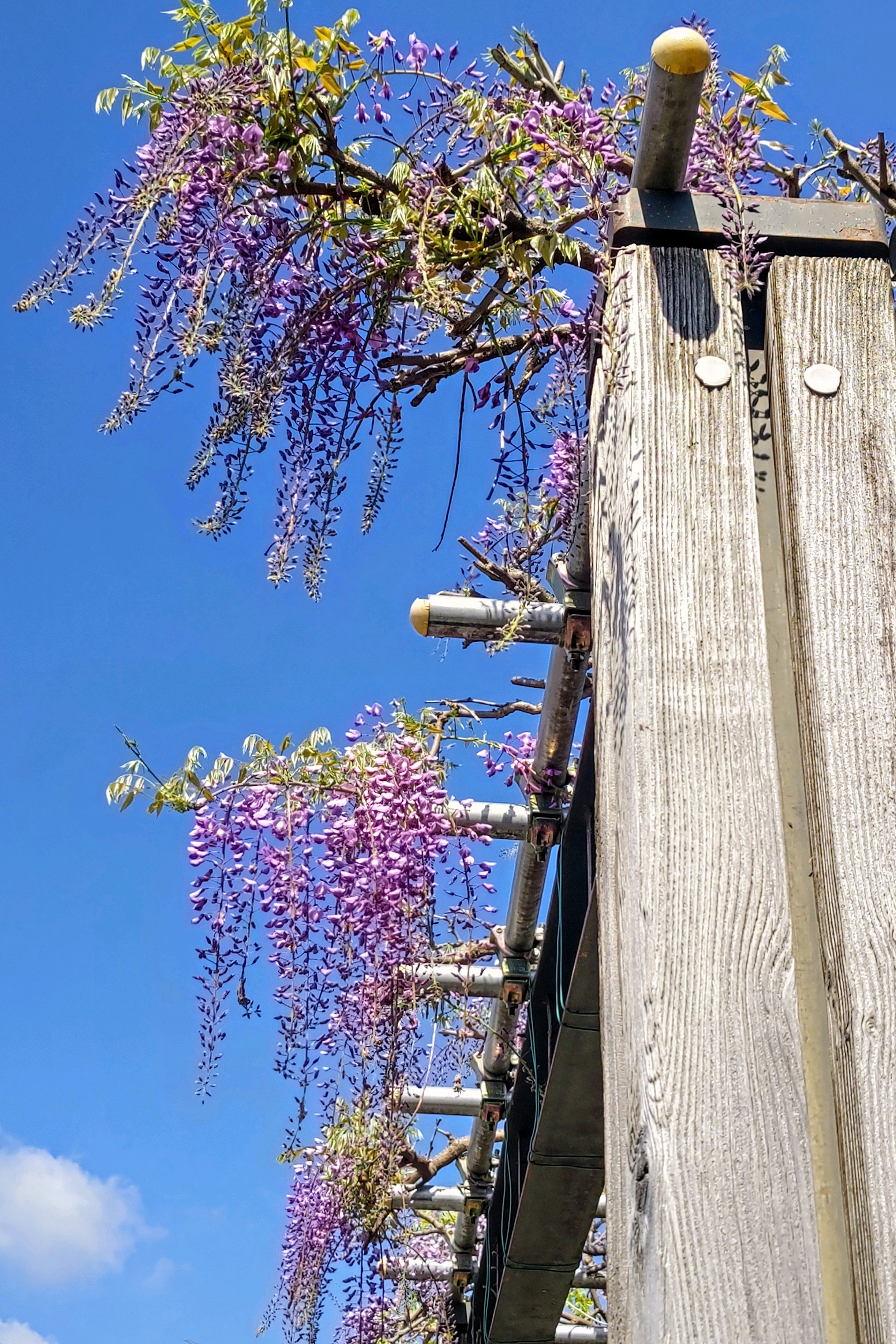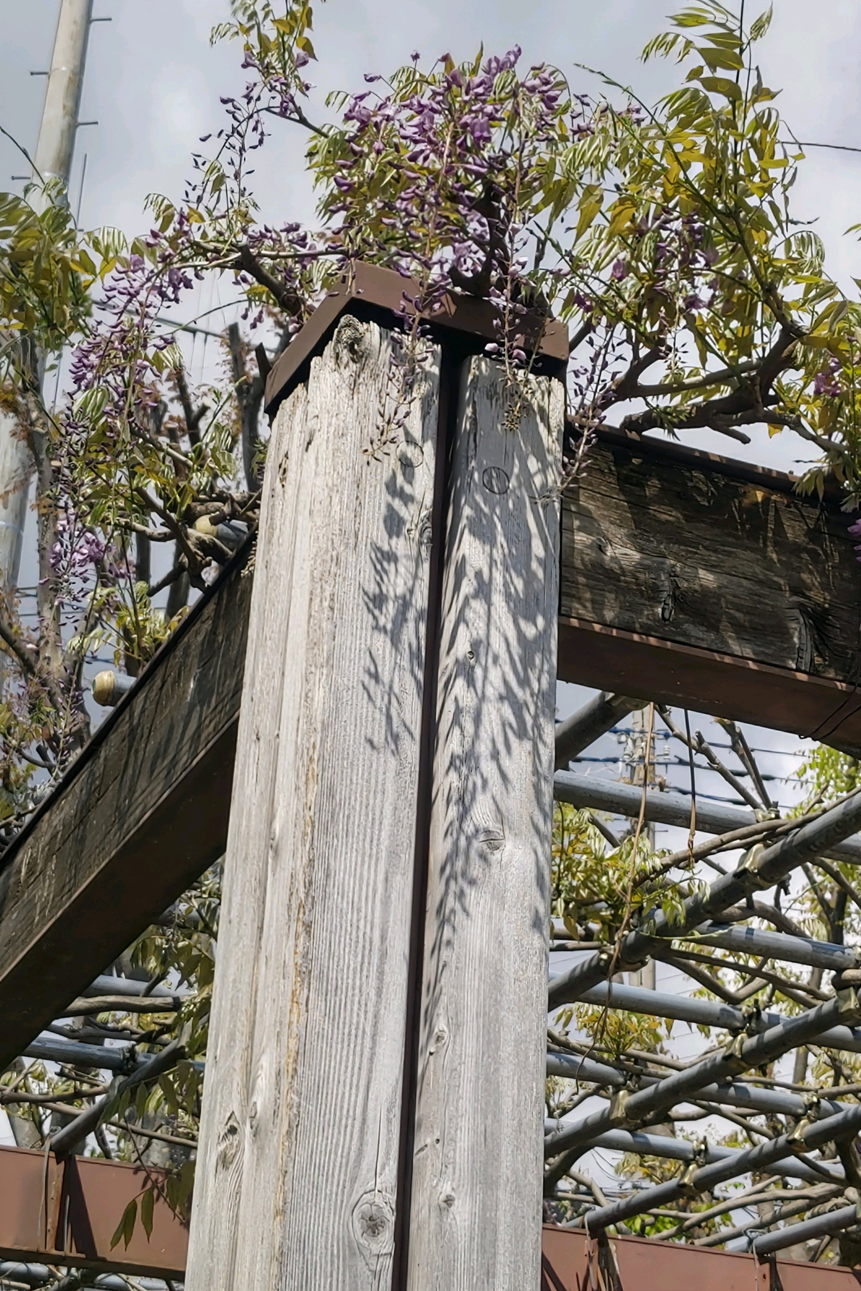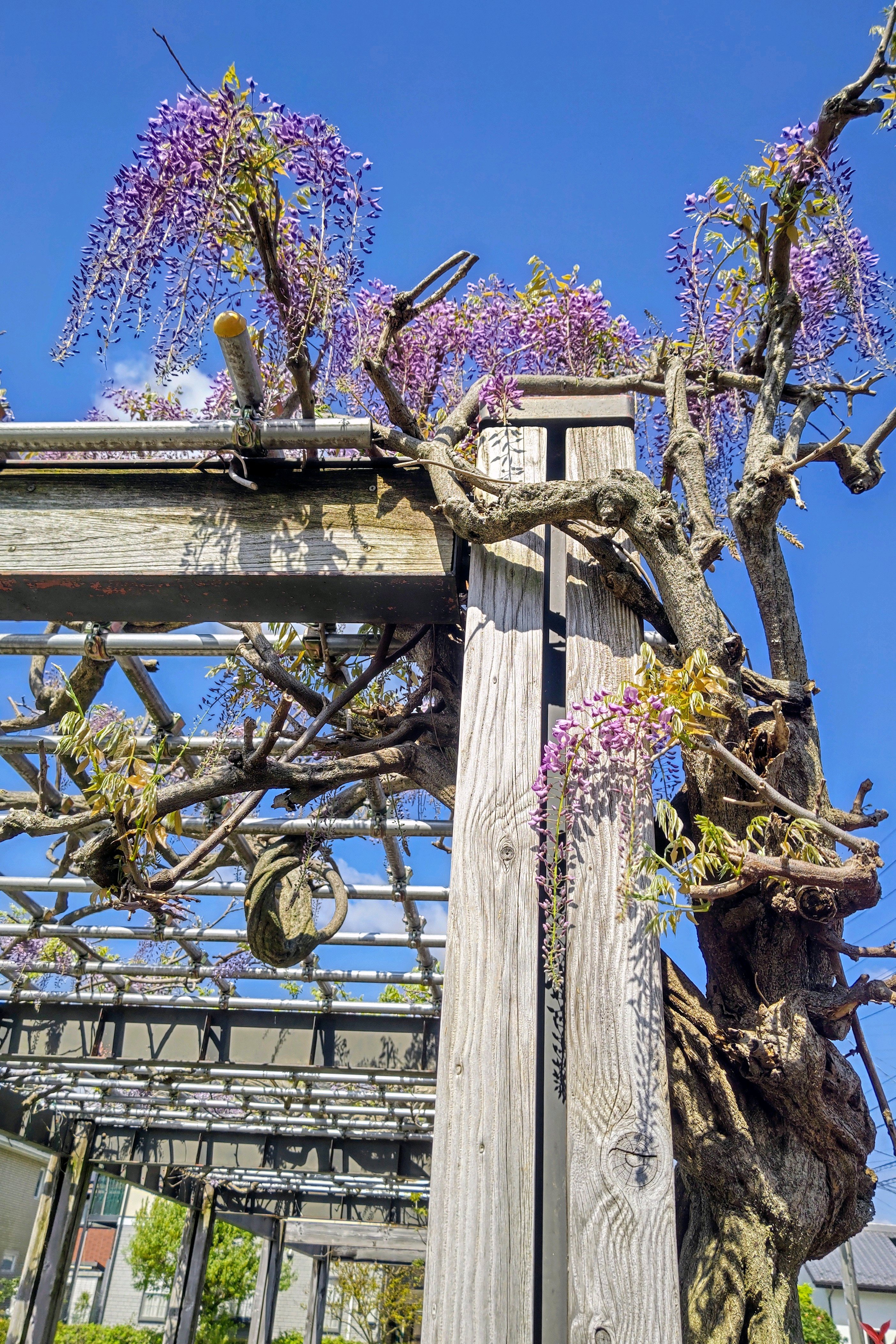 木製の枠組みに鉄骨が渡った、立派な藤棚