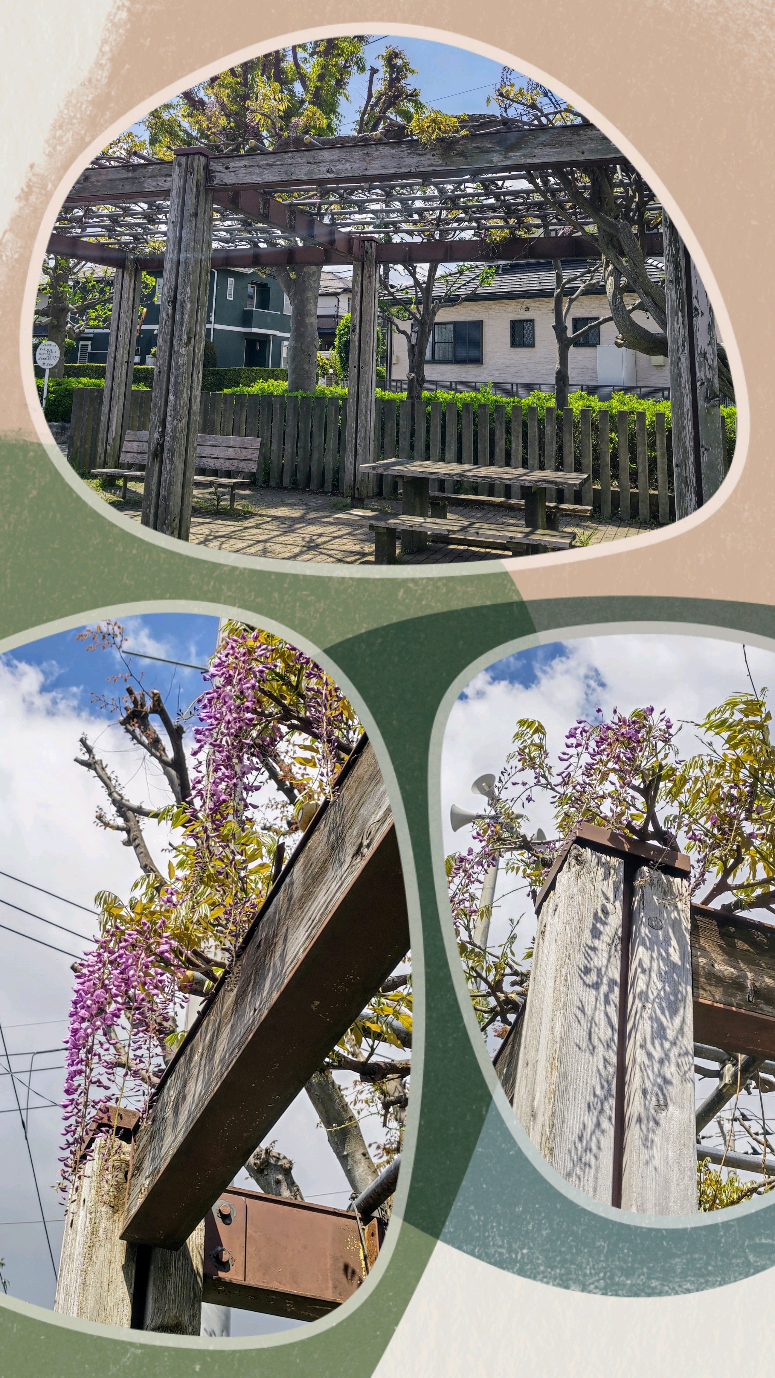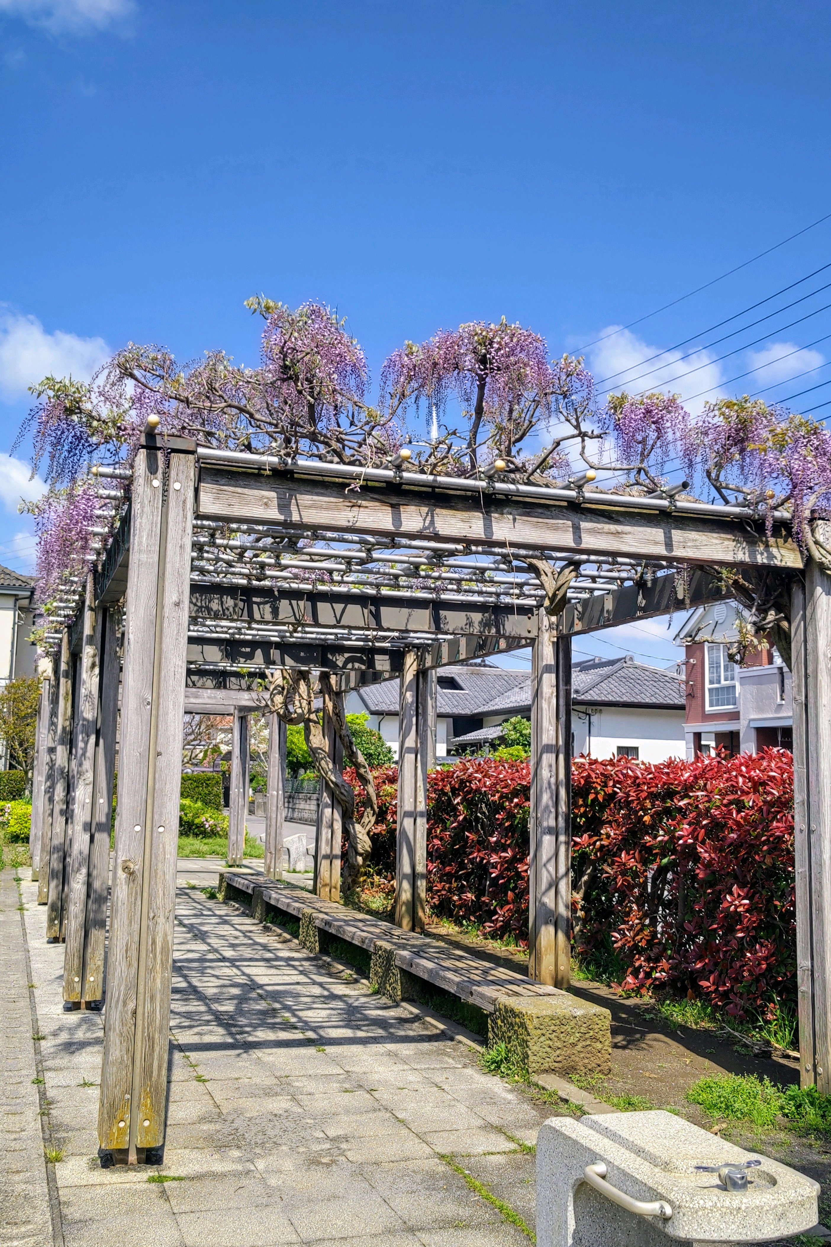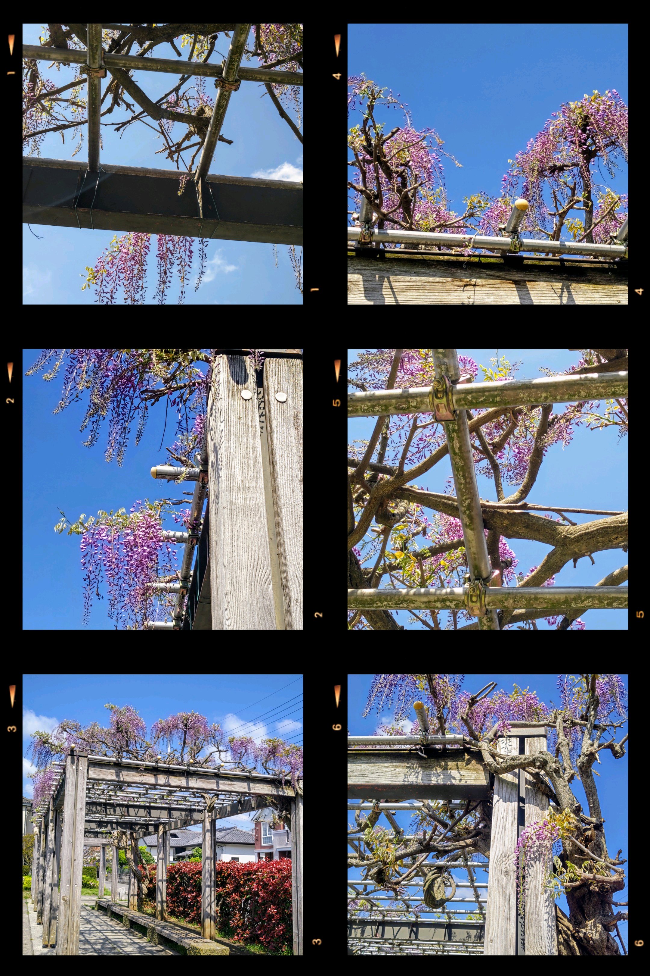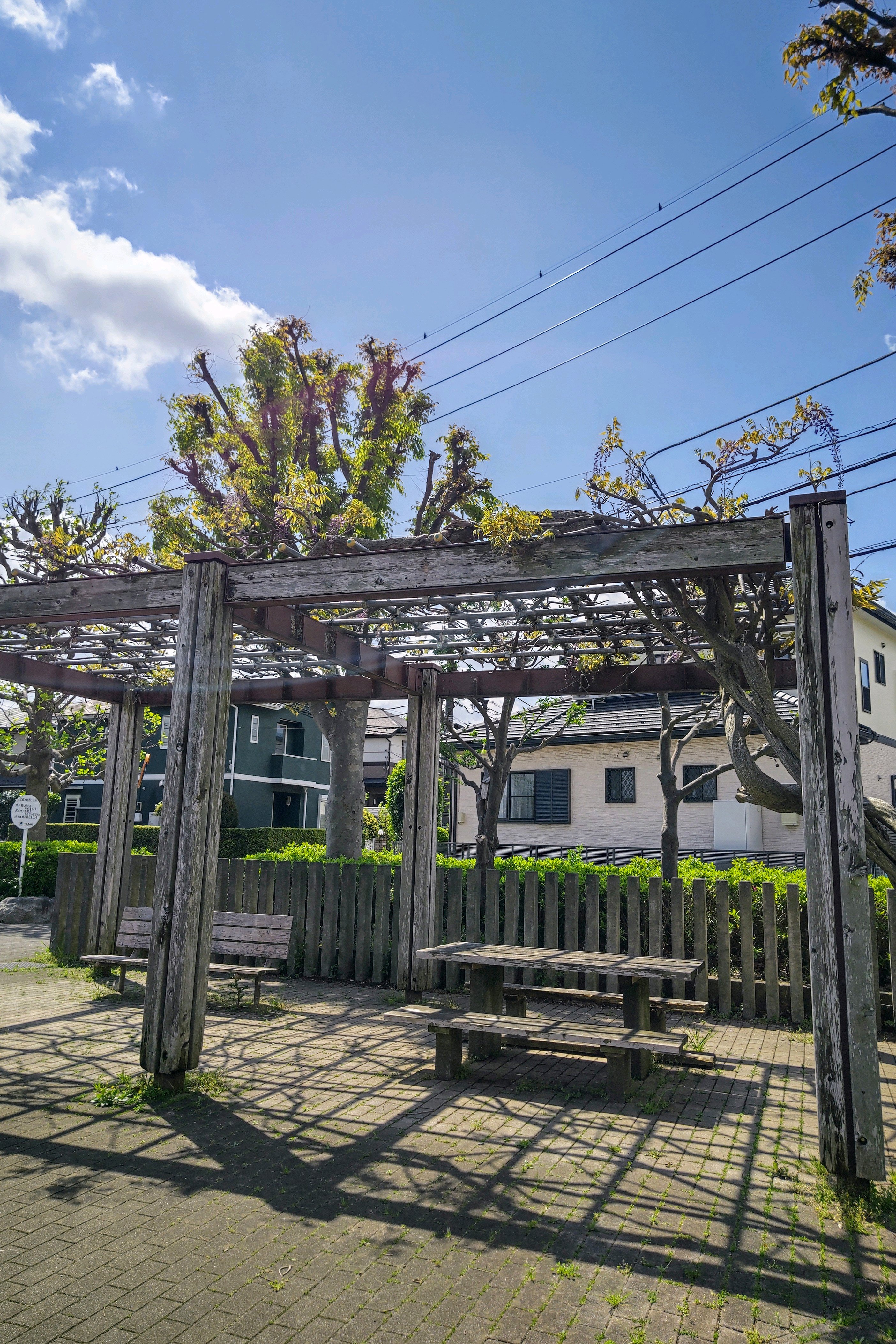 木製の枠組みに鉄骨が渡った、立派な藤棚
