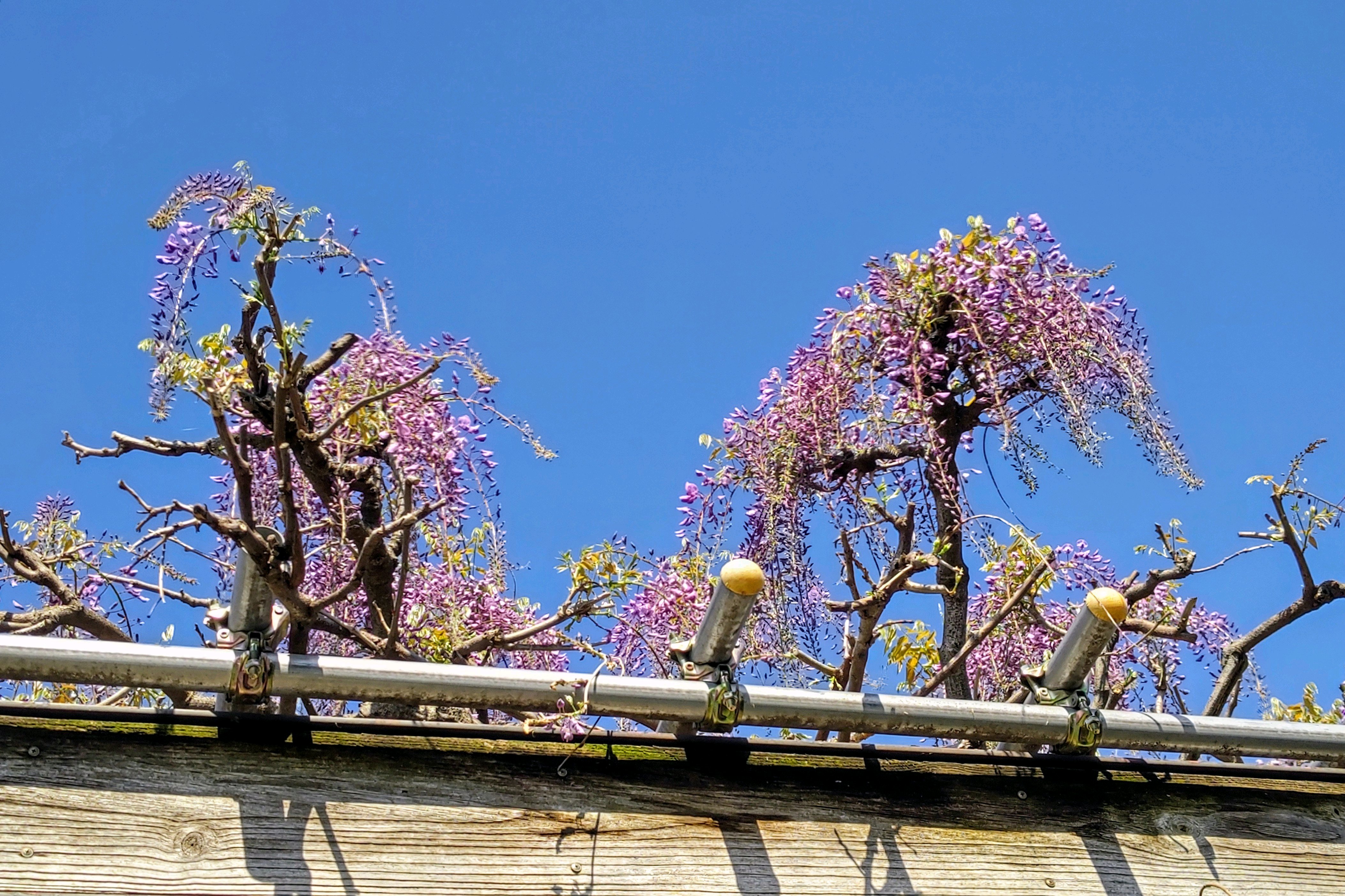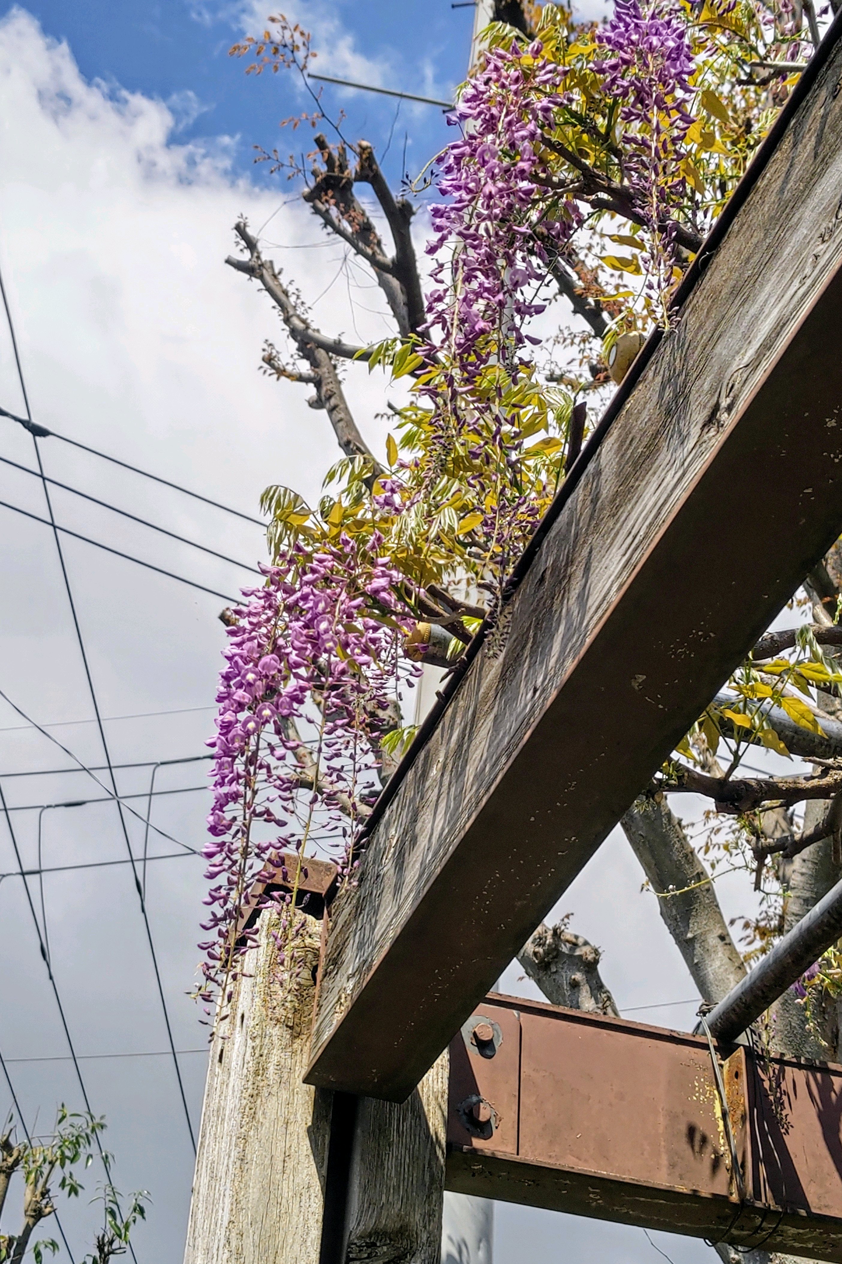 この藤棚の藤も強剪定を受けたのか、まばらに咲いて