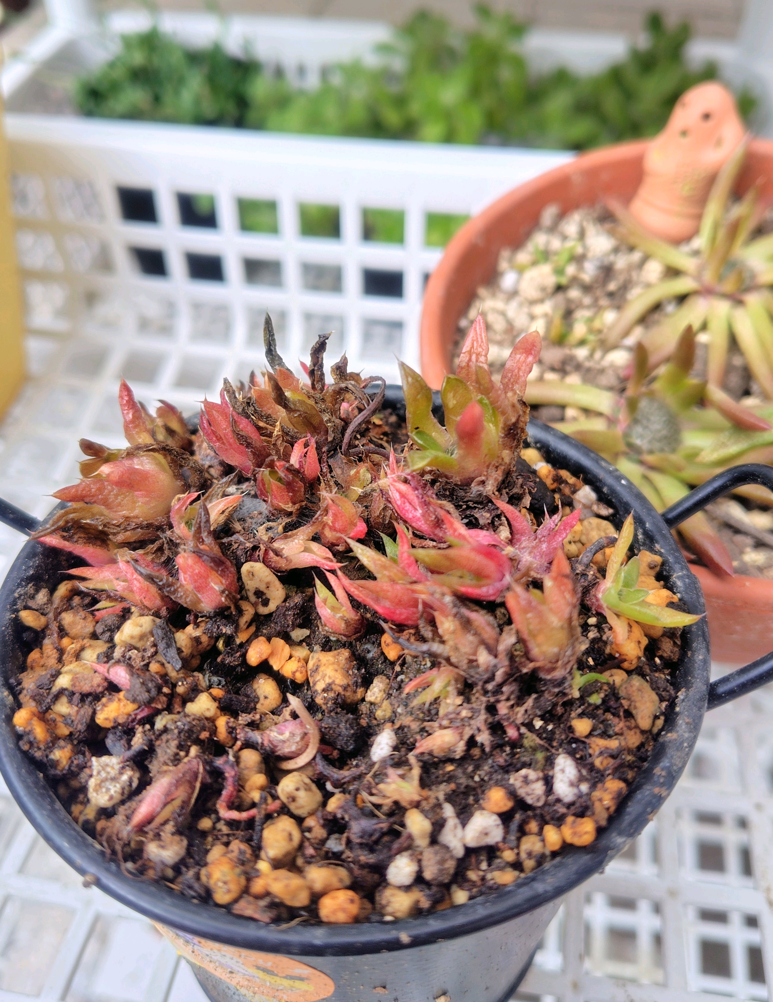 たまたまお邪魔した花友さん宅で、チリチリに焦げた?ツメレンゲに遭遇。