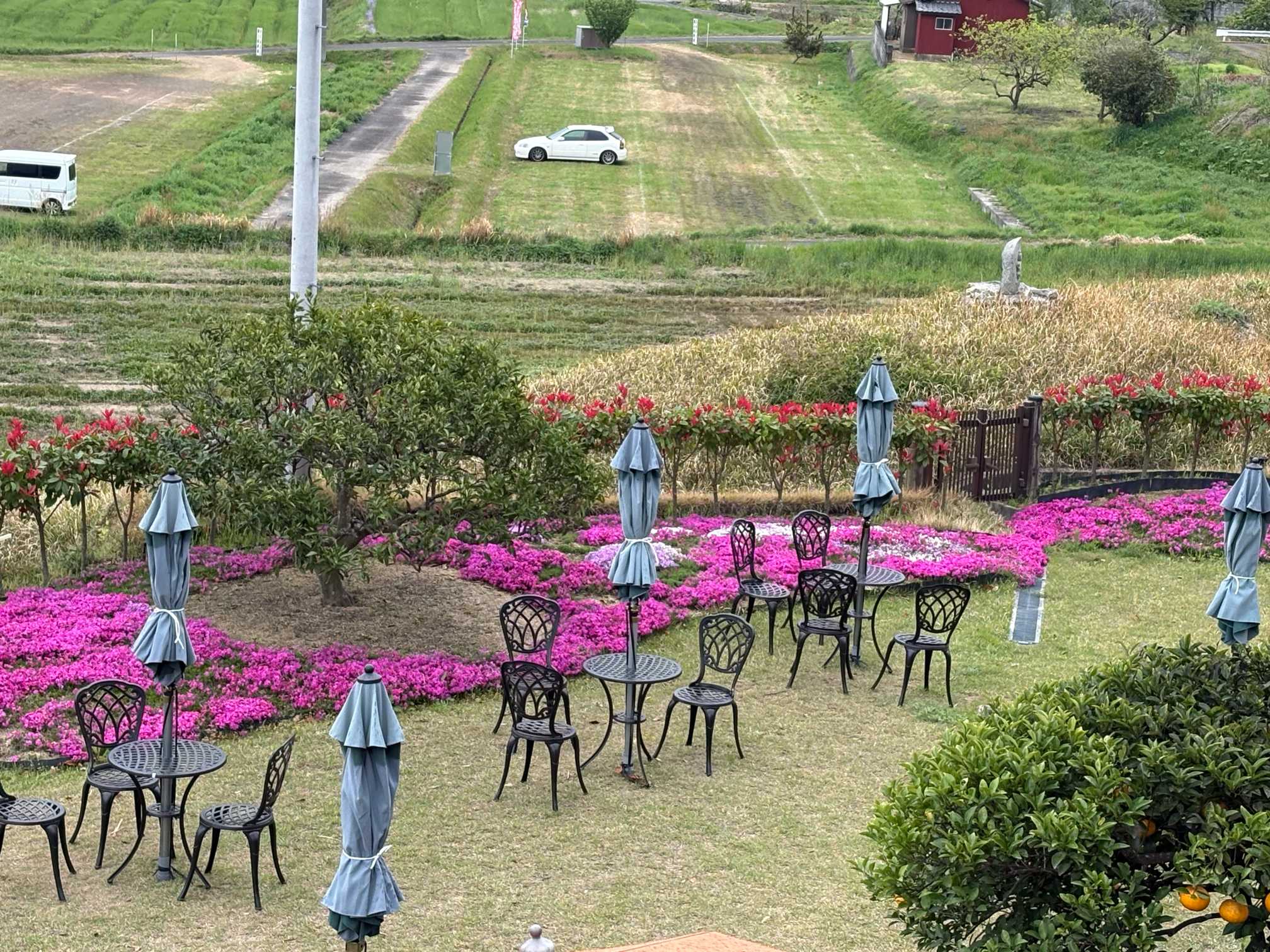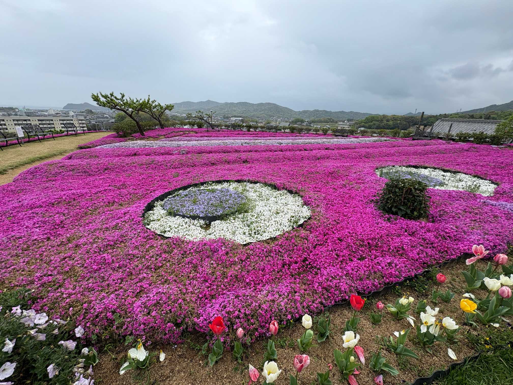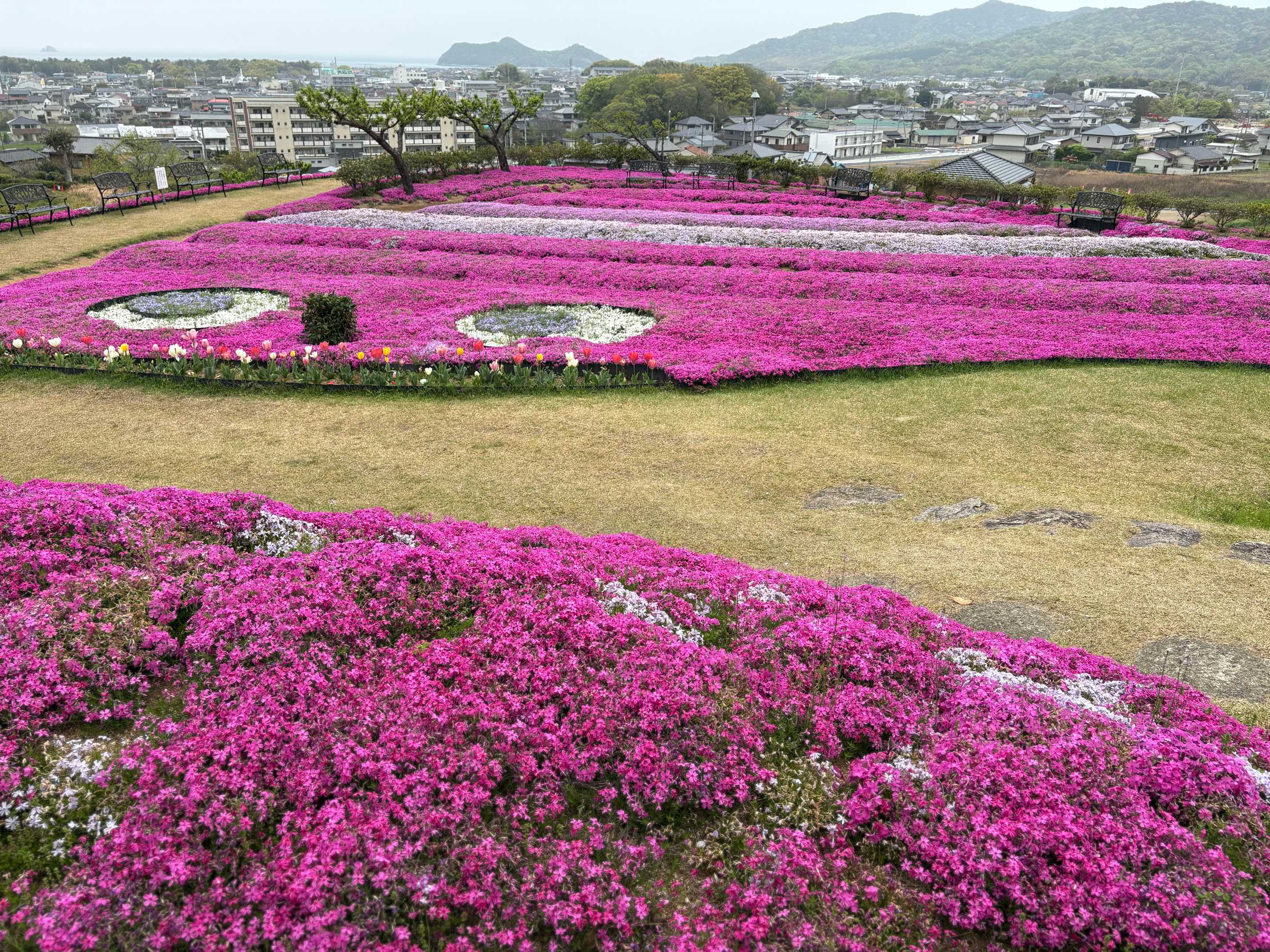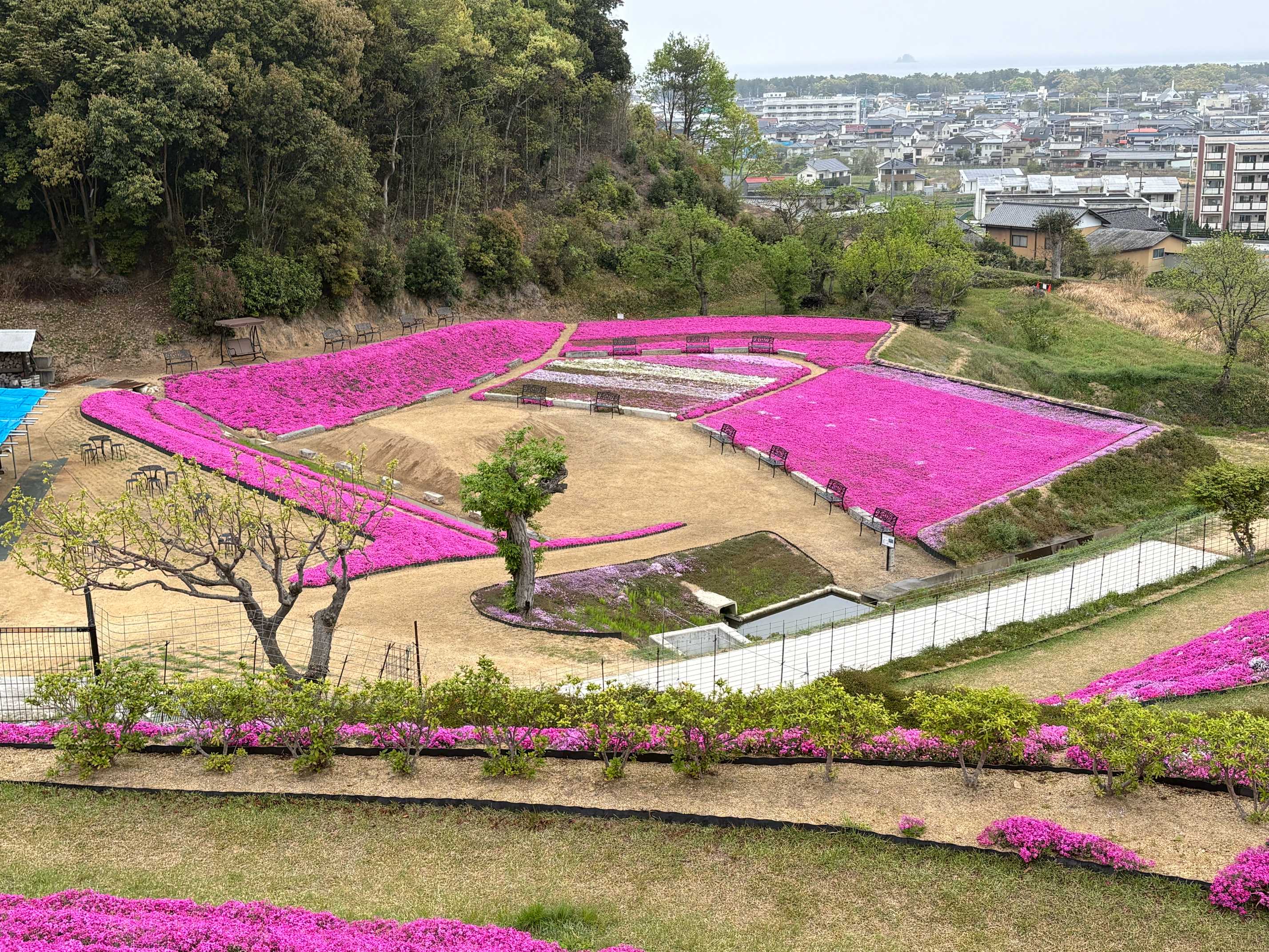 『芝桜富士』山頂からは、田舎町と瀬戸内海が一望できます。