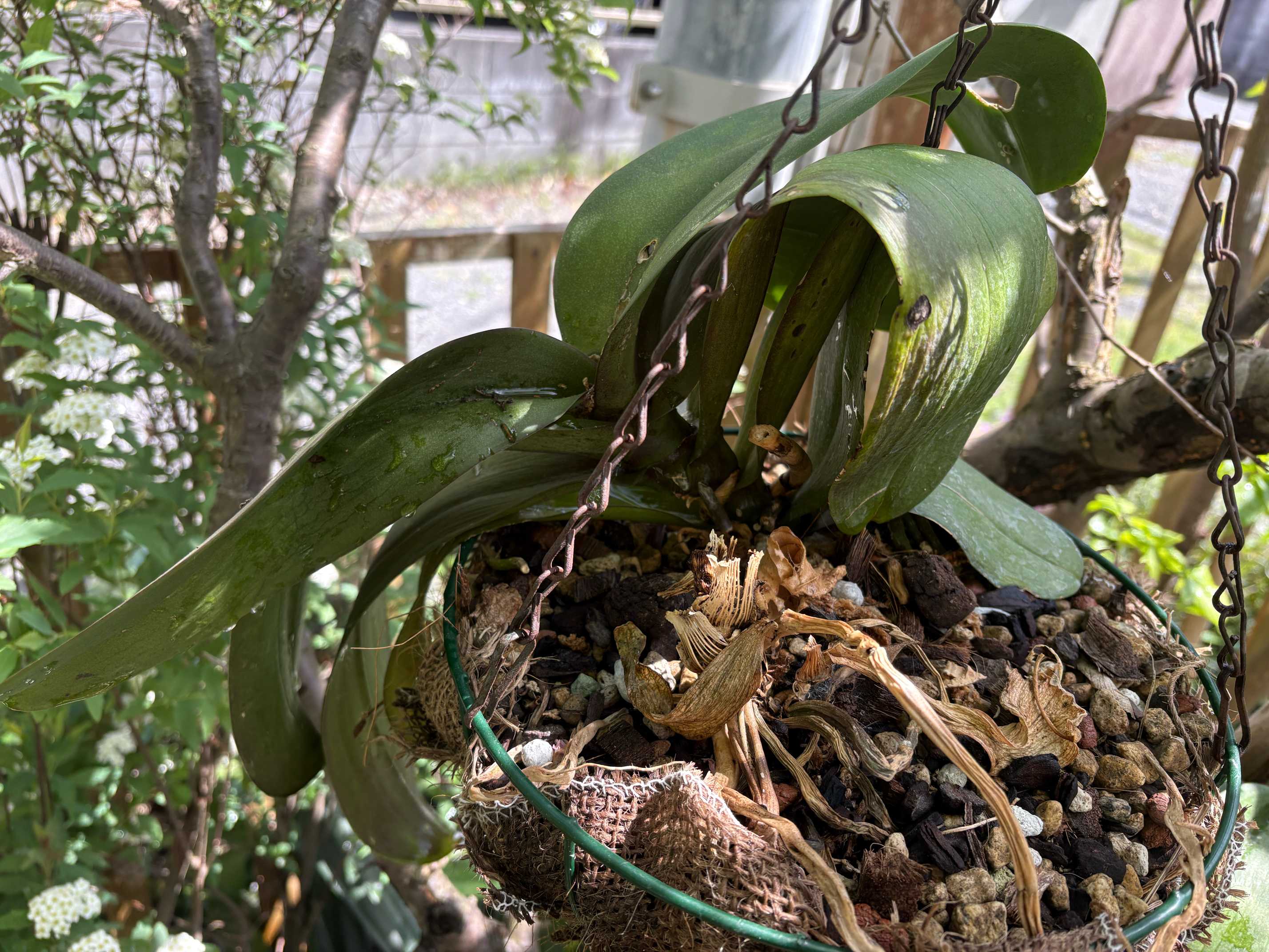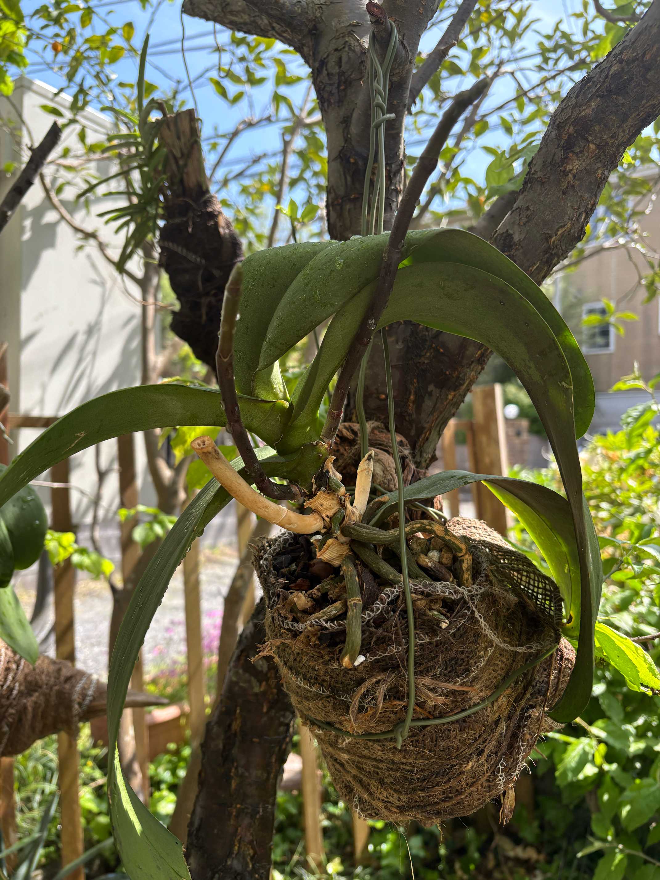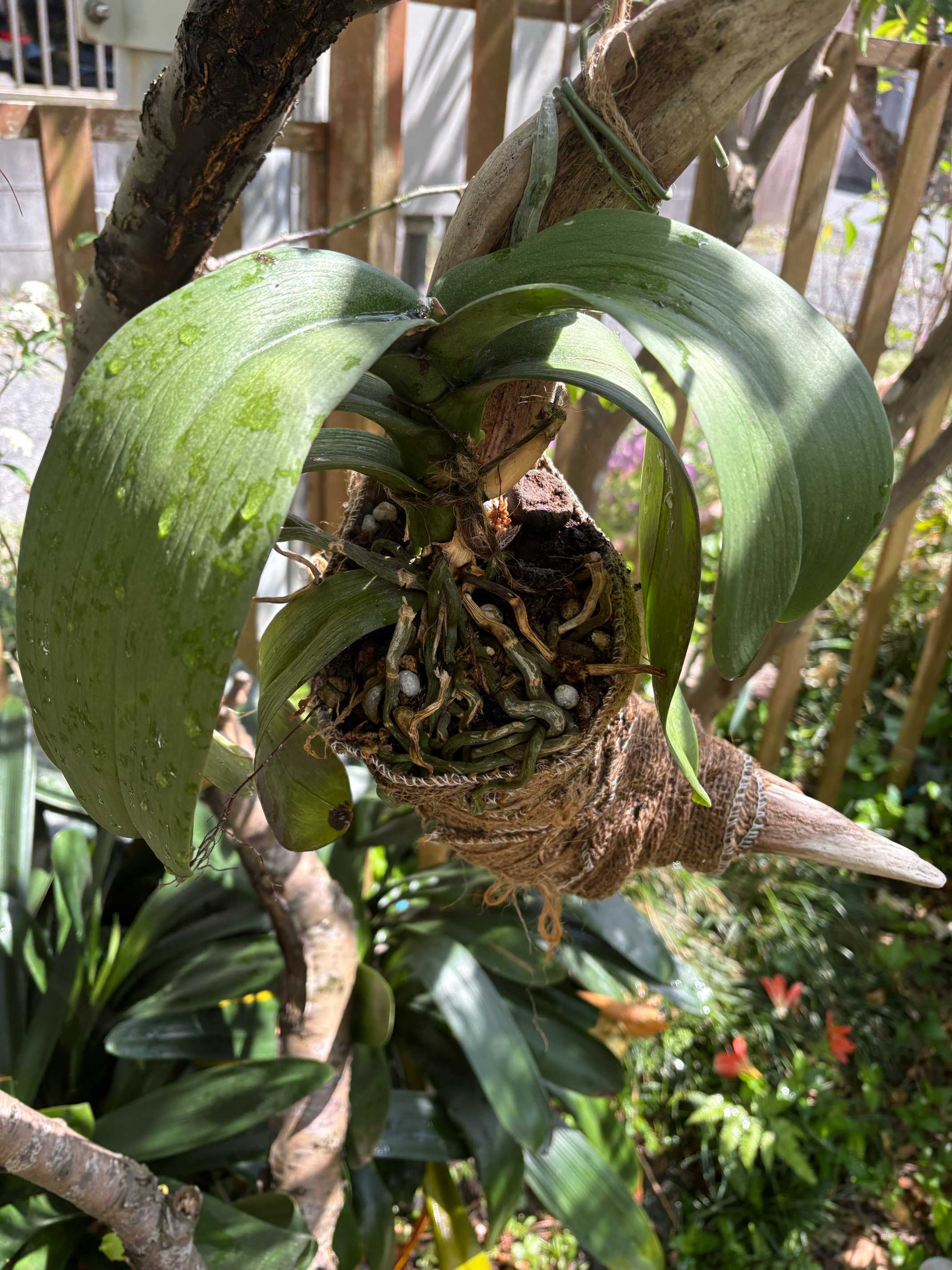 昨年六月に頂いた胡蝶蘭4ポット。流木に活着させて吊り下げて栽培をお試し中。1ポット分は枯れてしまいましたが残り3ポットは冬越しを終えてまた外に出しました。1鉢には花が付きそう。
