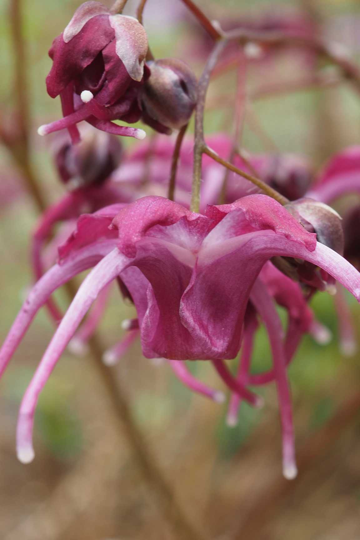 入り口の、イカリソウ(碇草)の紅花。『雪国植物園のピンクの花のイカリソウは(トキワイカリソウと)対比をするために植栽されたものである』(雪国植物園の花々)。