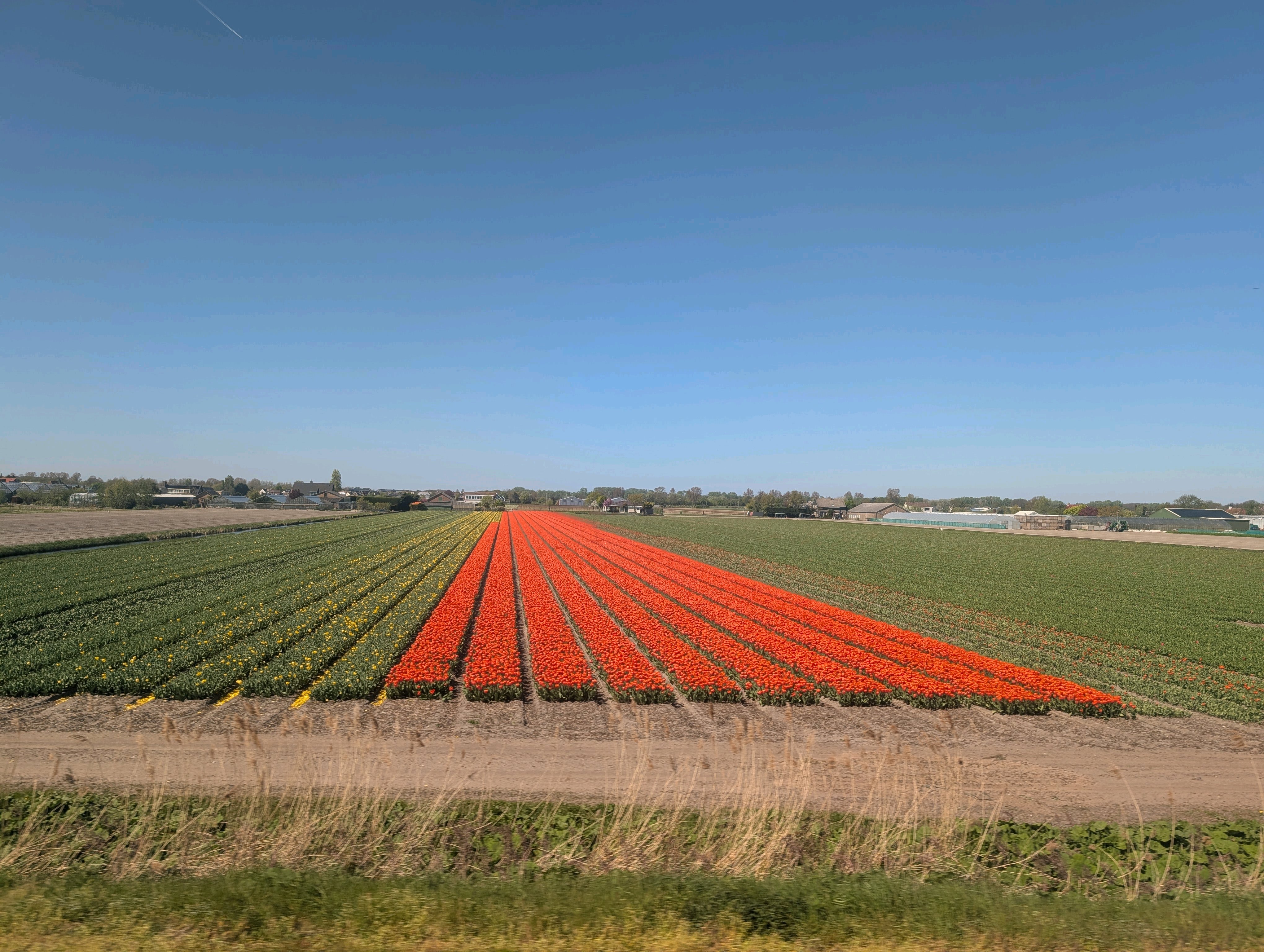 チューリップ畑にも切り花用と球根用とがあって、球根用だと球根を太らせる為にお花の部分だけ切っちゃいます。写真撮ってるのはお花のまだついた畑ですが、お花の部分を切り落として葉っぱだけになってる、かつ畝の間に花びらがめっちゃ落ちて花の道みたいになってる畑も沢山ありました。