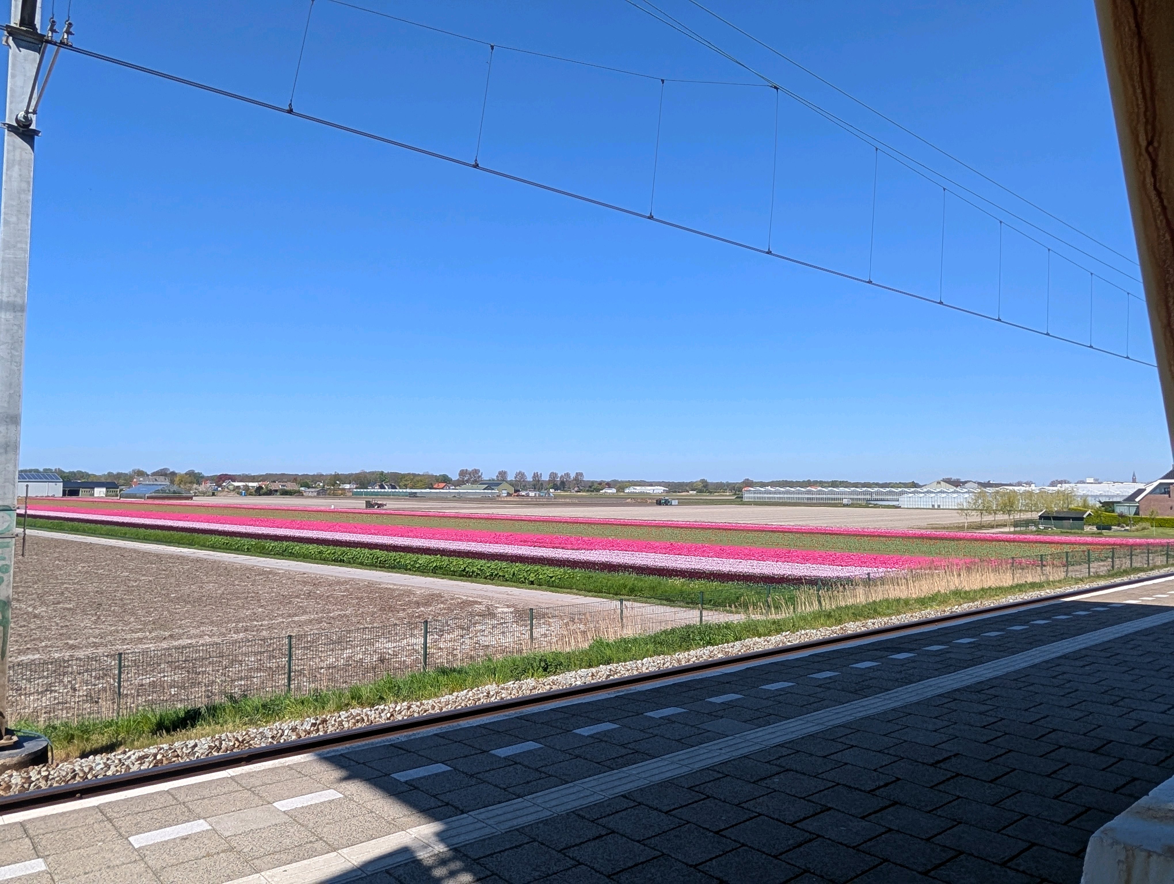 実はプラットフォームから駅の外へ出るのに2回エレベーターに乗らなきゃいけなくてそのエレベーター待ちのときにプラットフォームから撮ったもの。チューリップ畑のあるエリアに来てるとはいえ、これはテンション上がります!