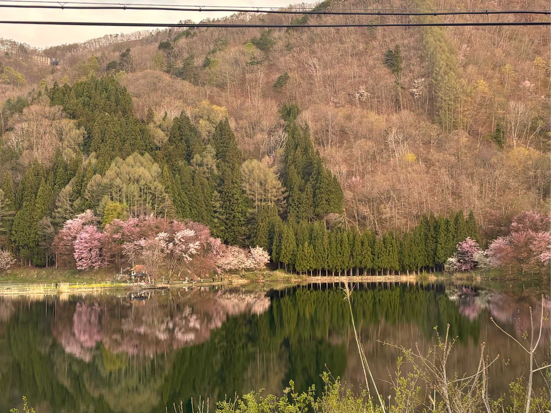 車中から見た中綱湖の水鏡てす。湖畔の、桜はまだ少し早かったけど、カメラマンが大勢いましたよ。🌸