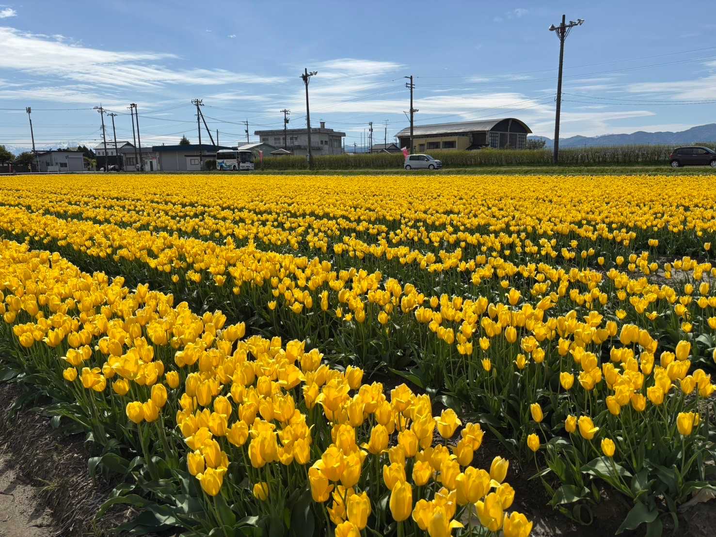 一面に黄色のチューリップがお出迎えです、、遠くには白山が見えていましたよ。ボランティアのガイドさんの説明がお上手です。