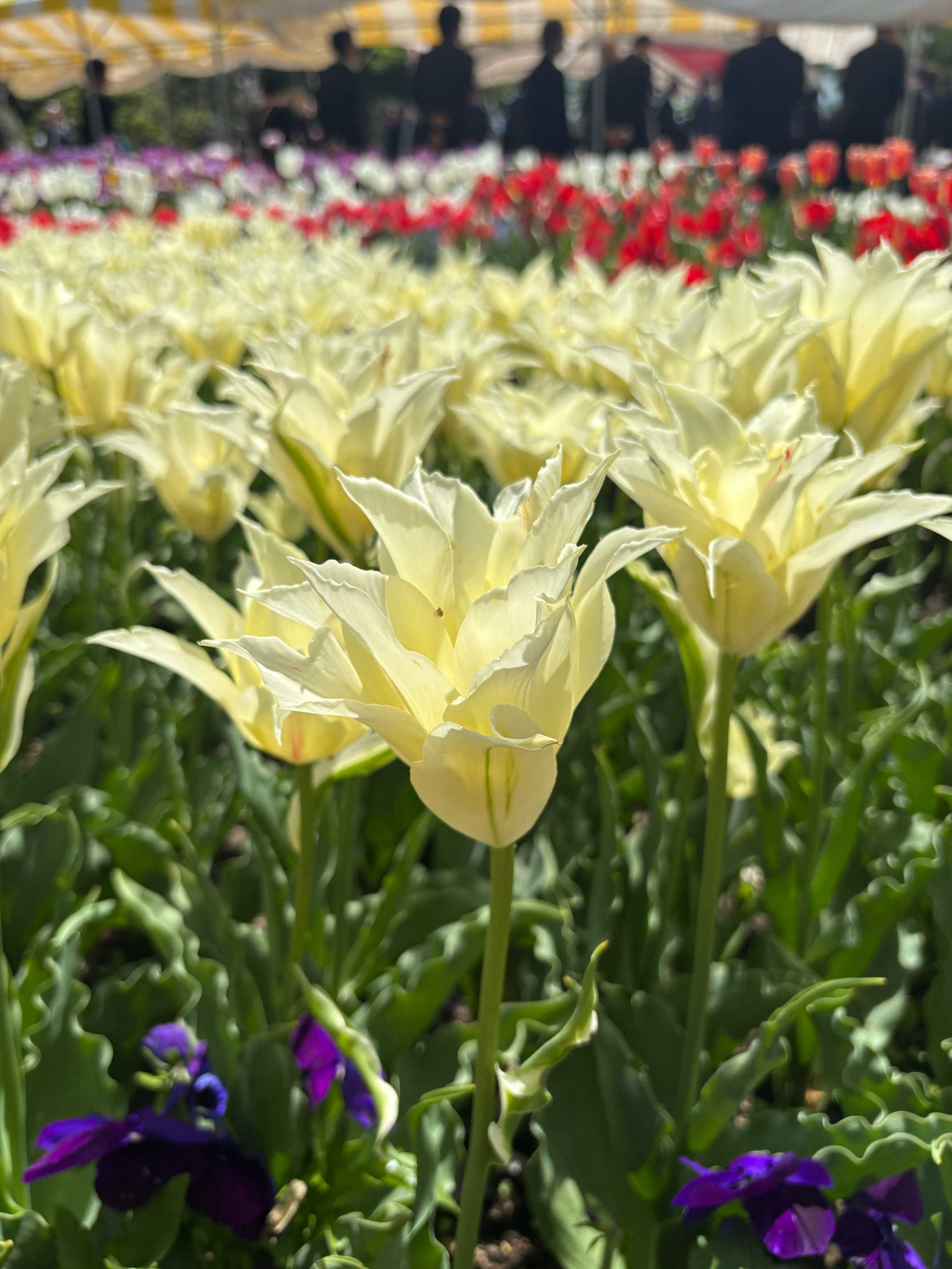 奥には色とりどりのチューリップが