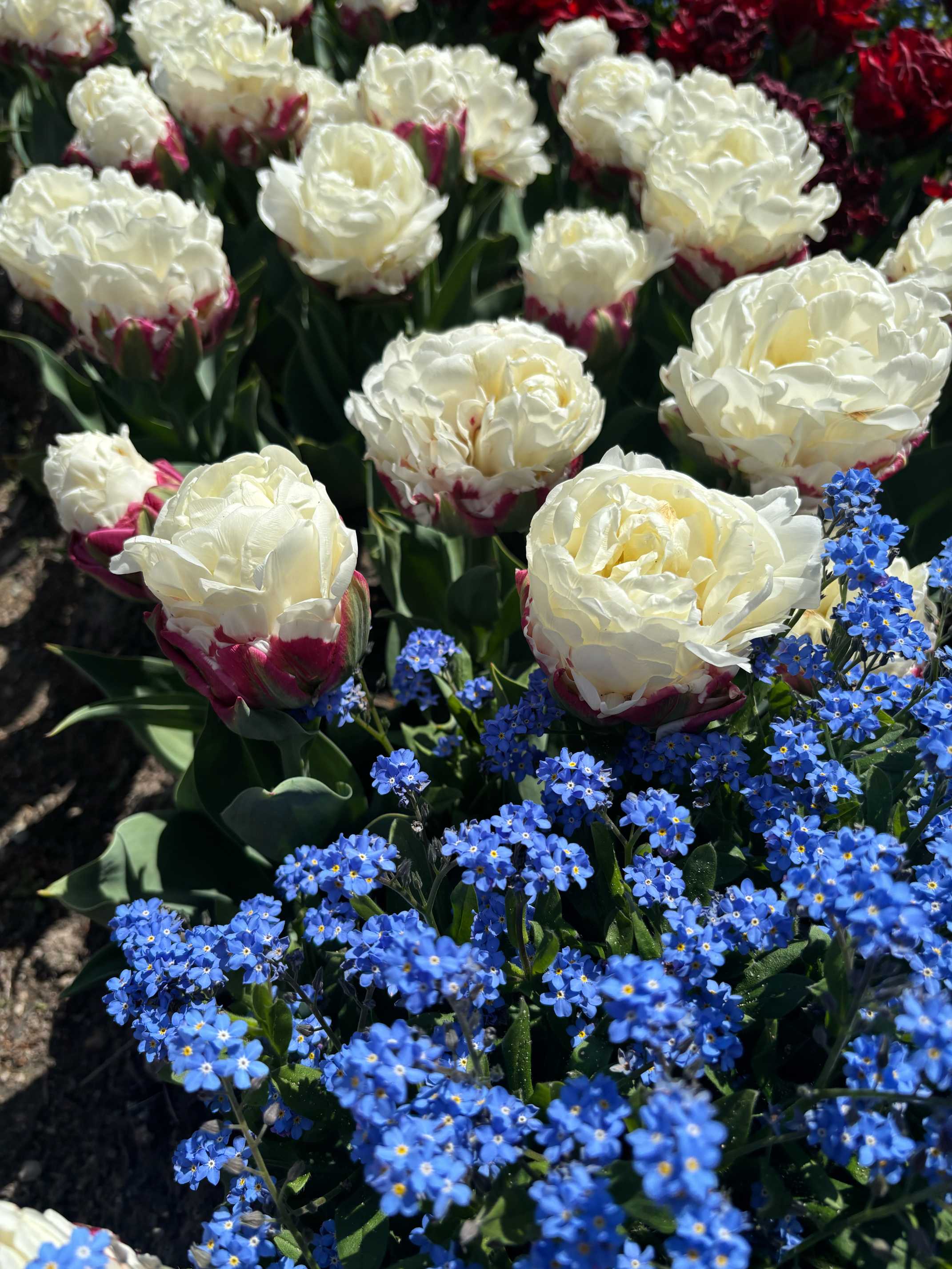 モリモリした忘れな草に囲まれた、まるまるしたお花は?これもチューリップさん、お名前がアイスクリームですって。八重晩咲きとありました。