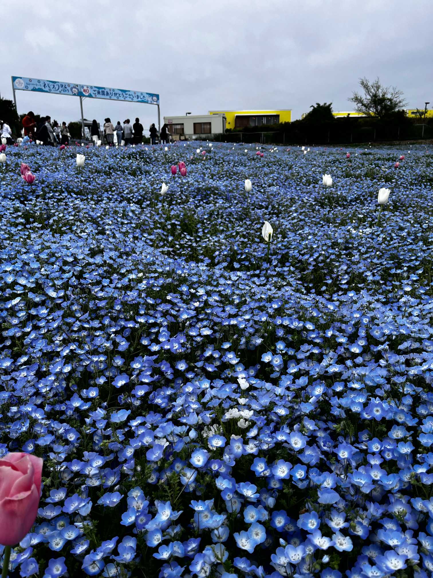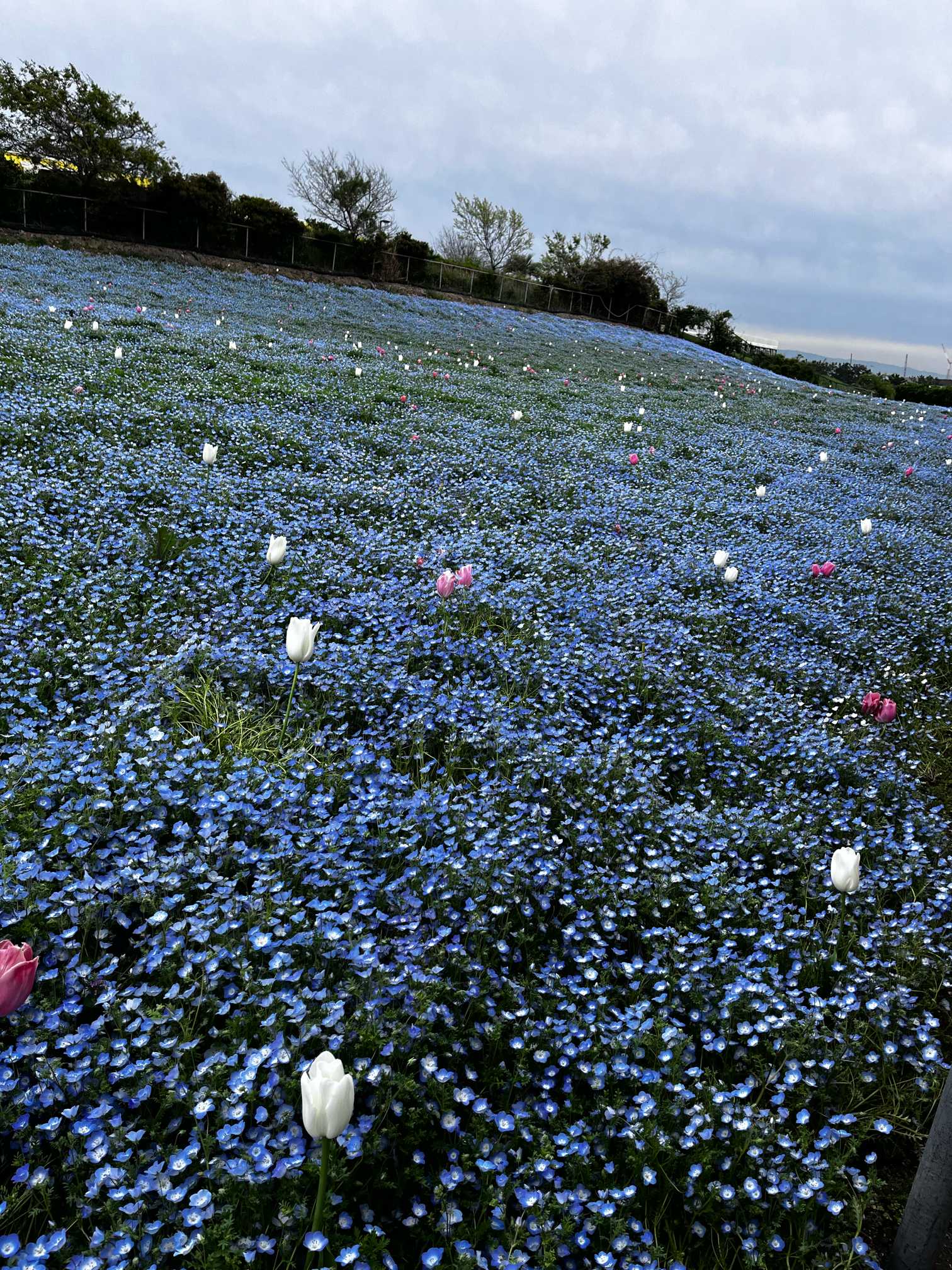 ネモフィラの間の所々に、ライトのようだけど白🤍とピンク🩷色のチューリップ🌷が可愛いです❣️
