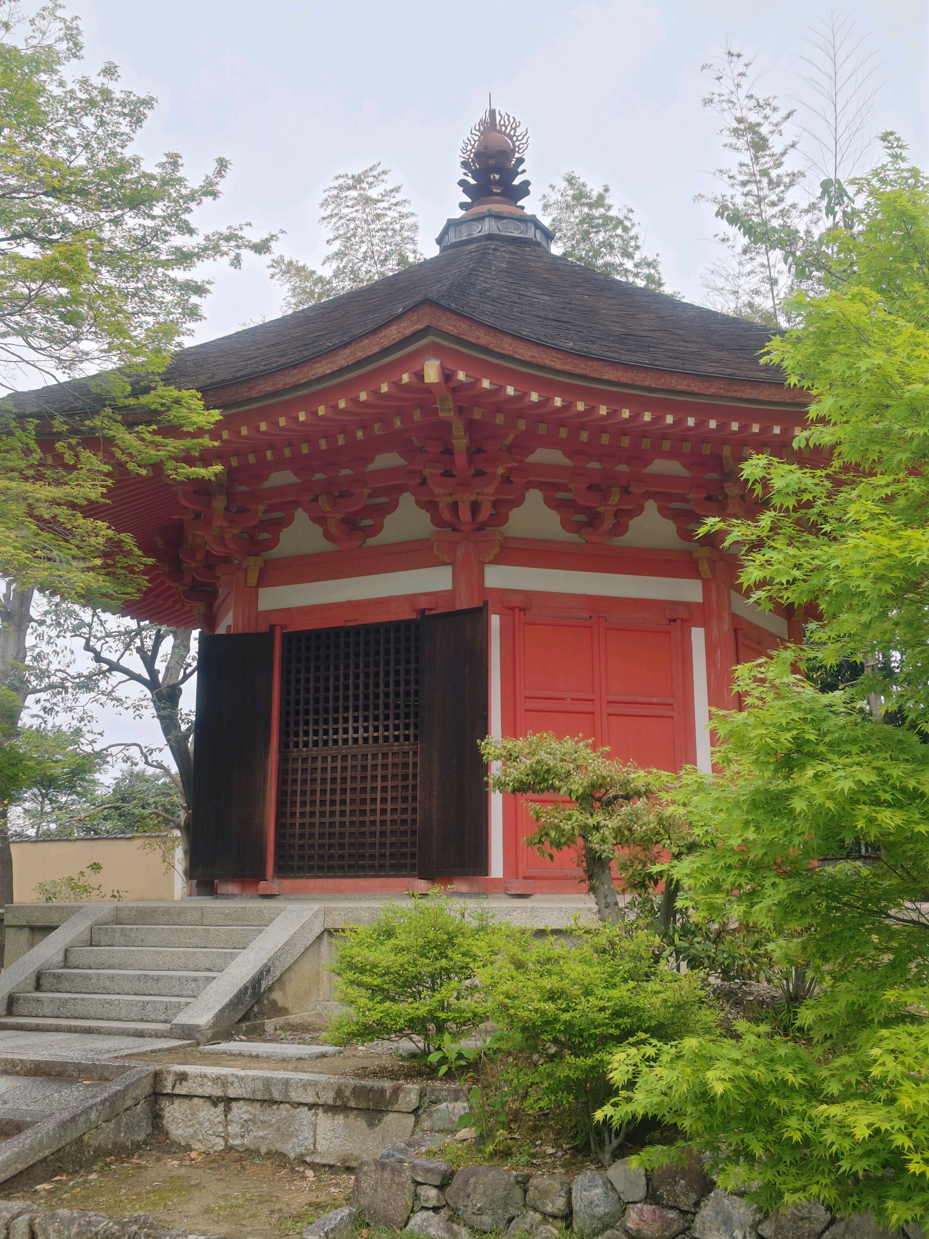 丹塗り(にぬり)の柿葺き(こけらぶき)八角円堂。