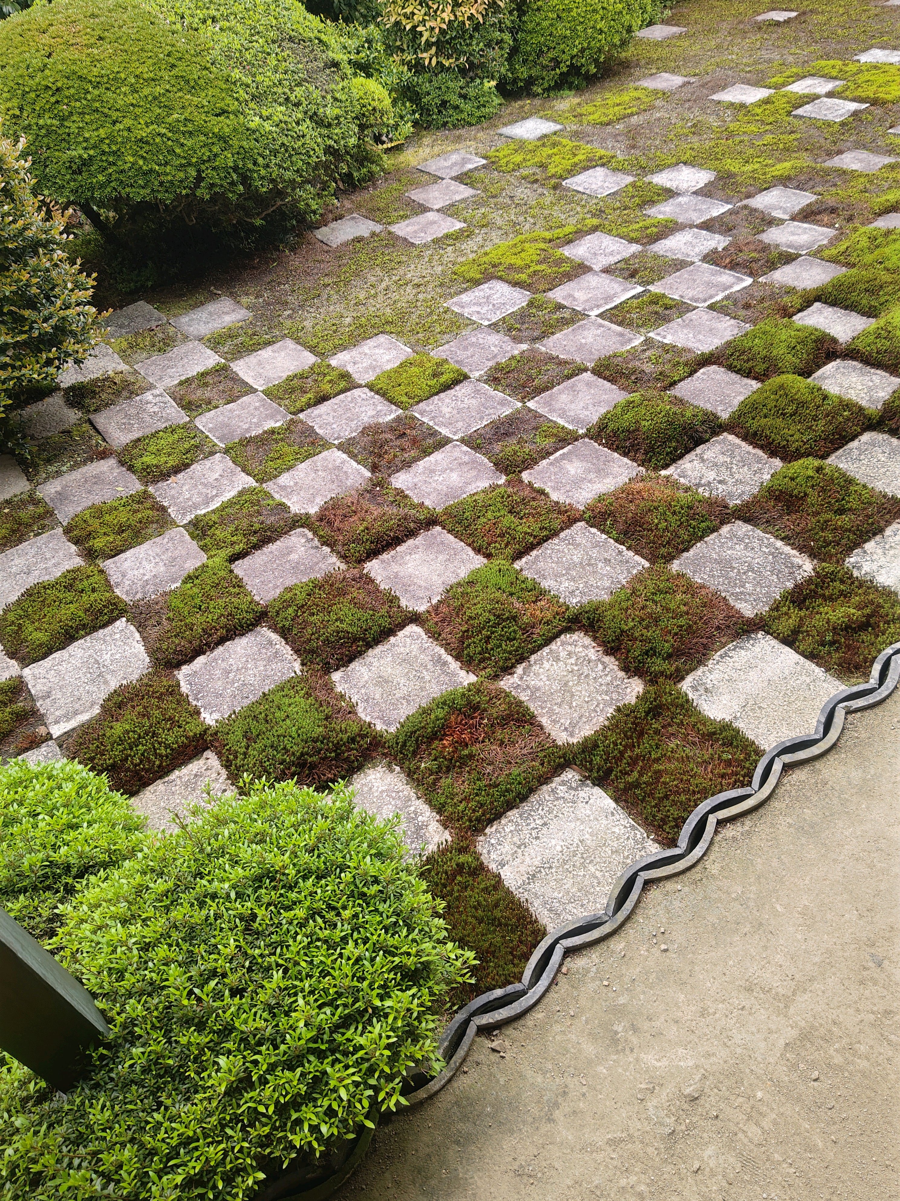 ⑳敷石と苔が市松模様になった、方丈北側の庭。