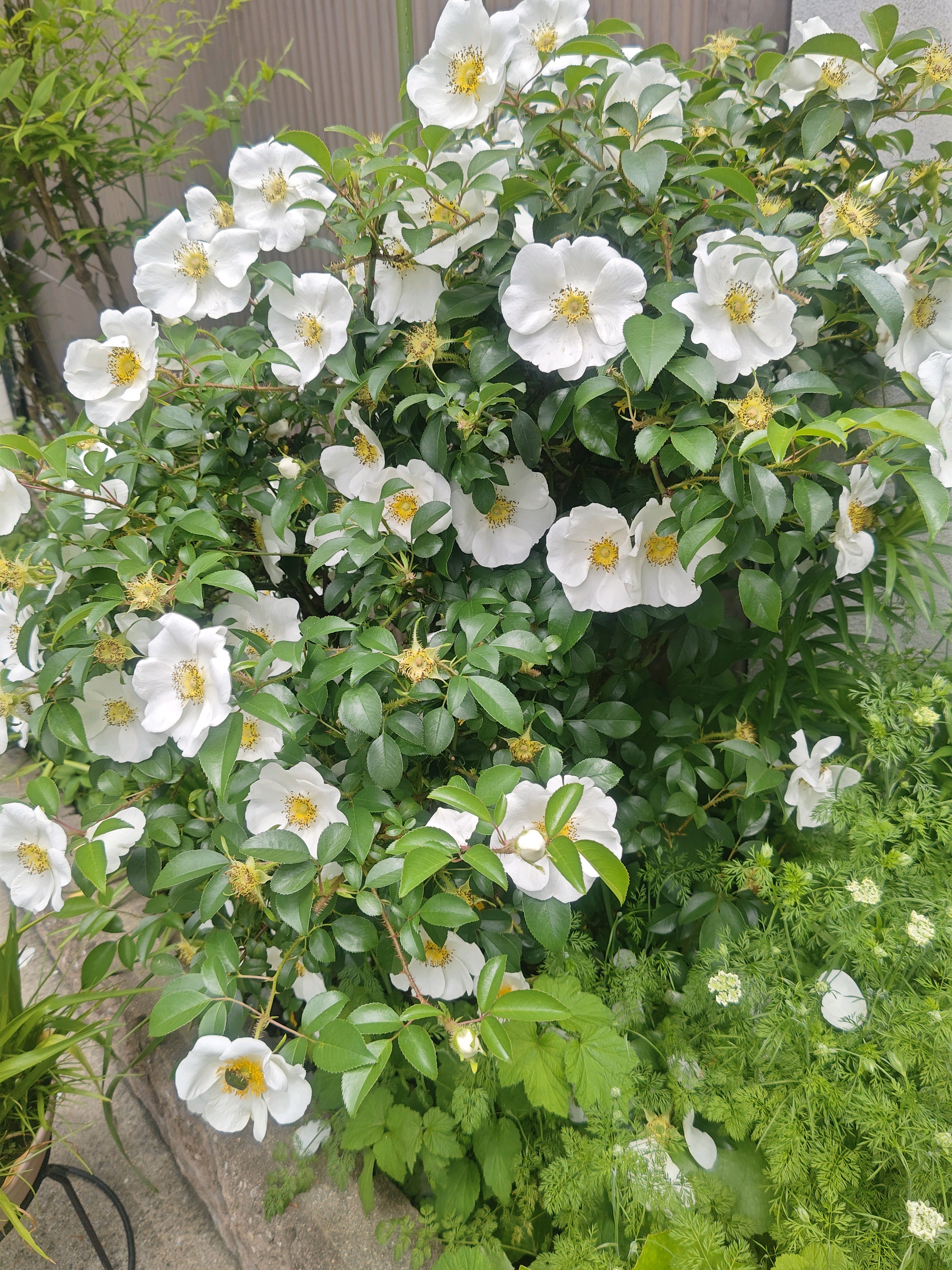 帰り道、鉢植えで見事に咲いてたナニワイバラ。