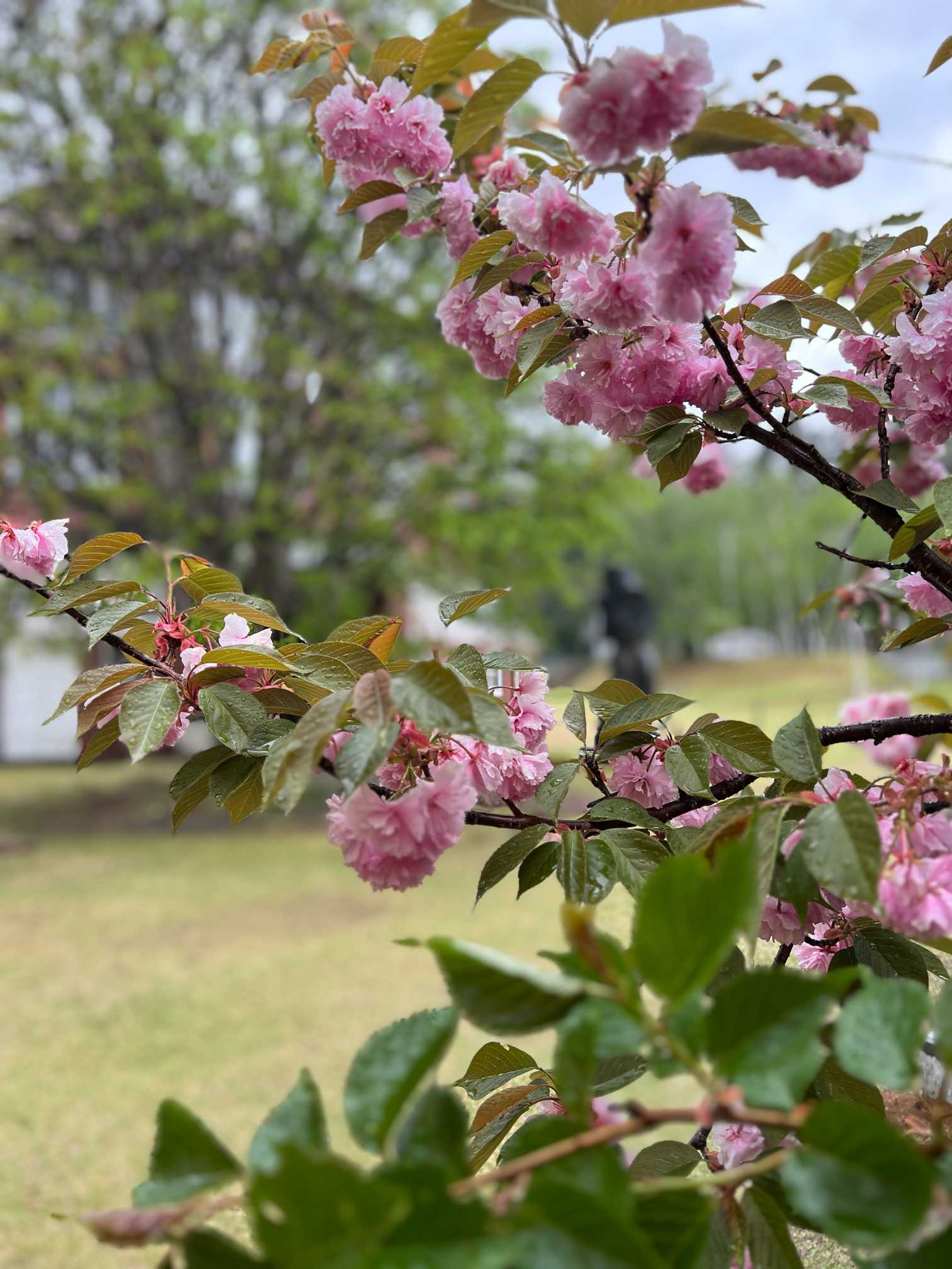 そもそもこちらの敷地は樹齢70年80年といった桜の老木、失礼大木に囲まれています。ソメイヨシノには遅かったのですが、八重桜が待っていてくれました