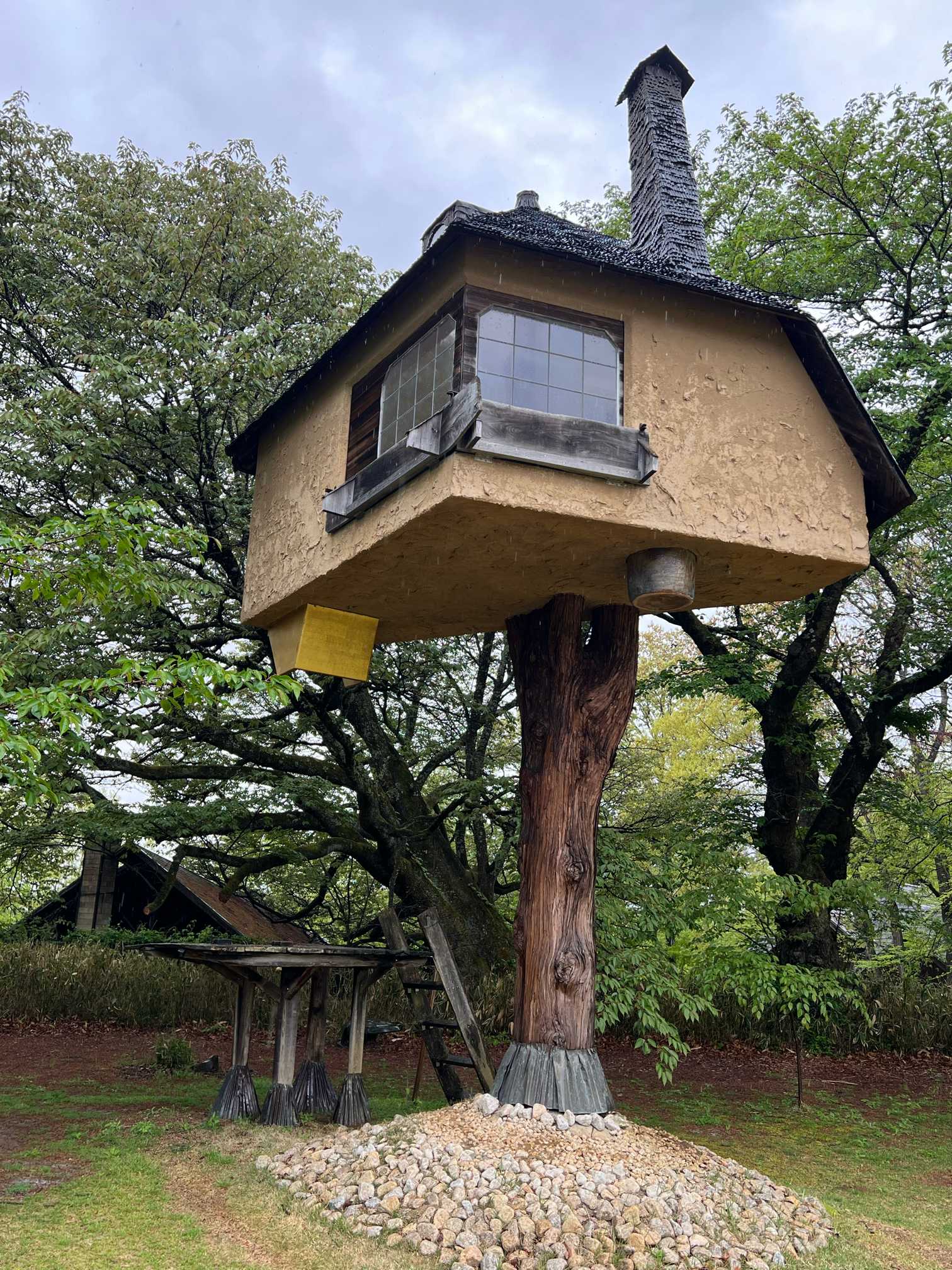 藤森照信設計。1.7坪の茶室を支える木は樹齢80年の檜。建築にあたっては赤瀬川原平や南伸坊もお手伝いなさったとか