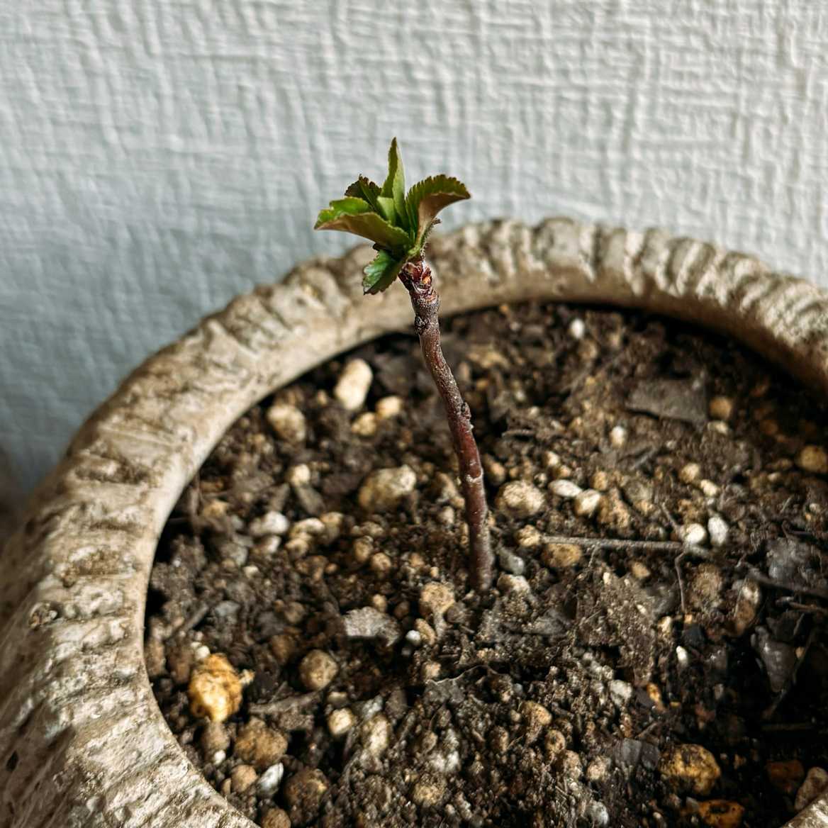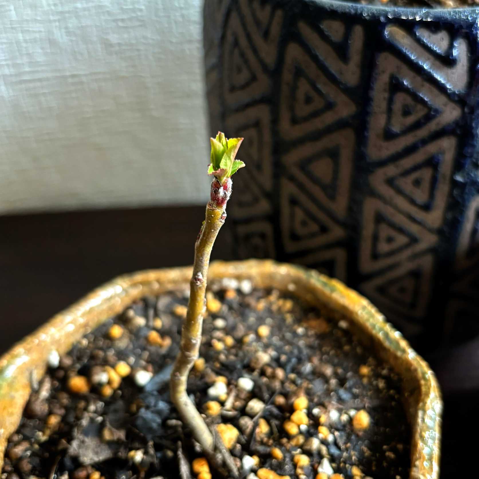 冬芽の状態で越冬していたマルスプミラたち。気温が春らしくなってきた今日この頃、2つの鉢から小さな緑色が覗いている。