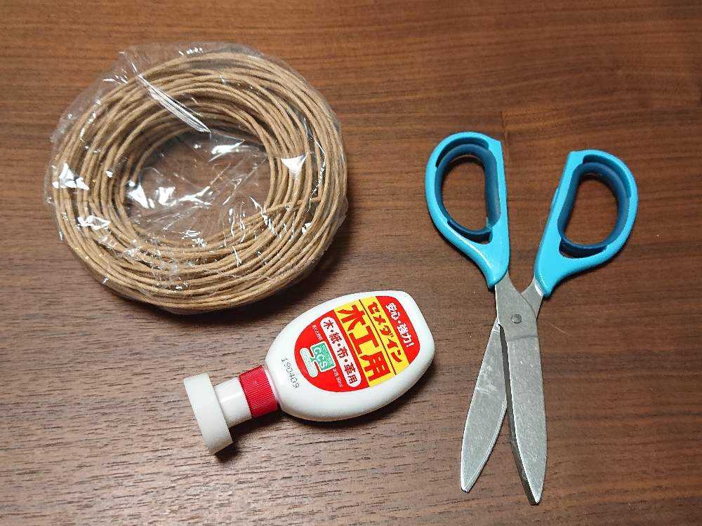 ボンドが乾いたら、テーブルなどに、テープで紙ヒモを付けます。