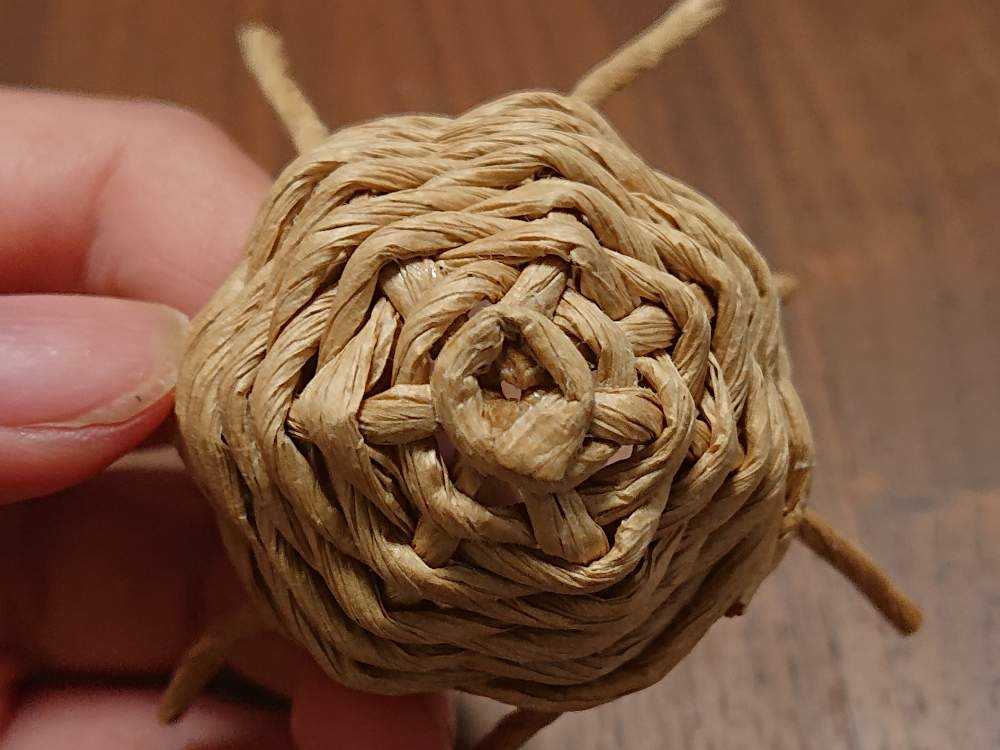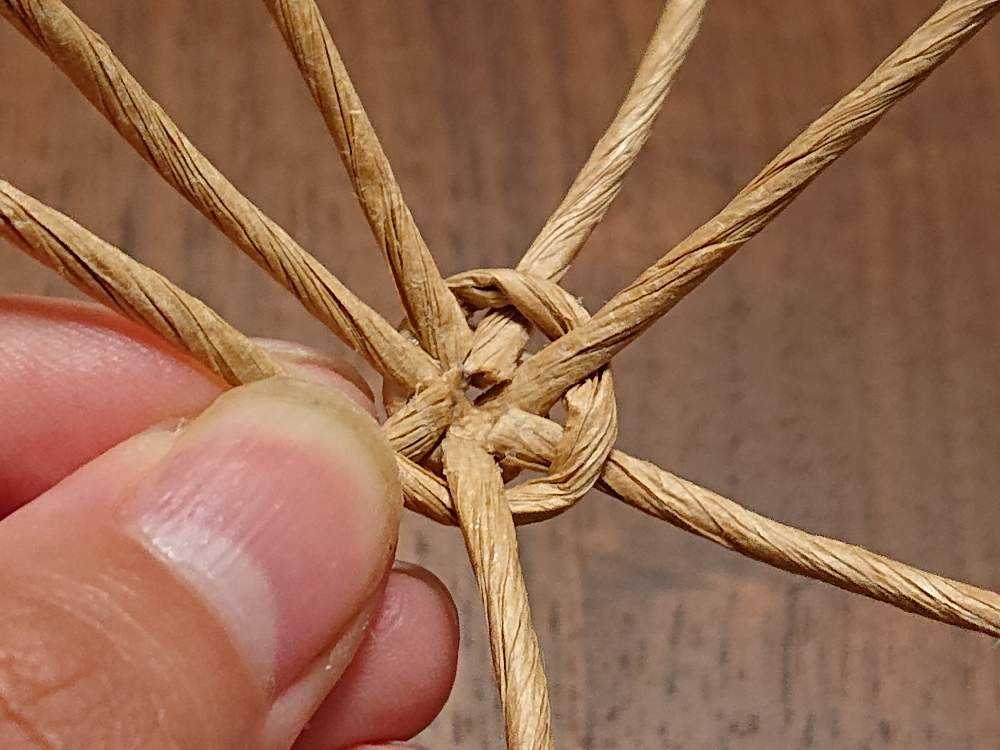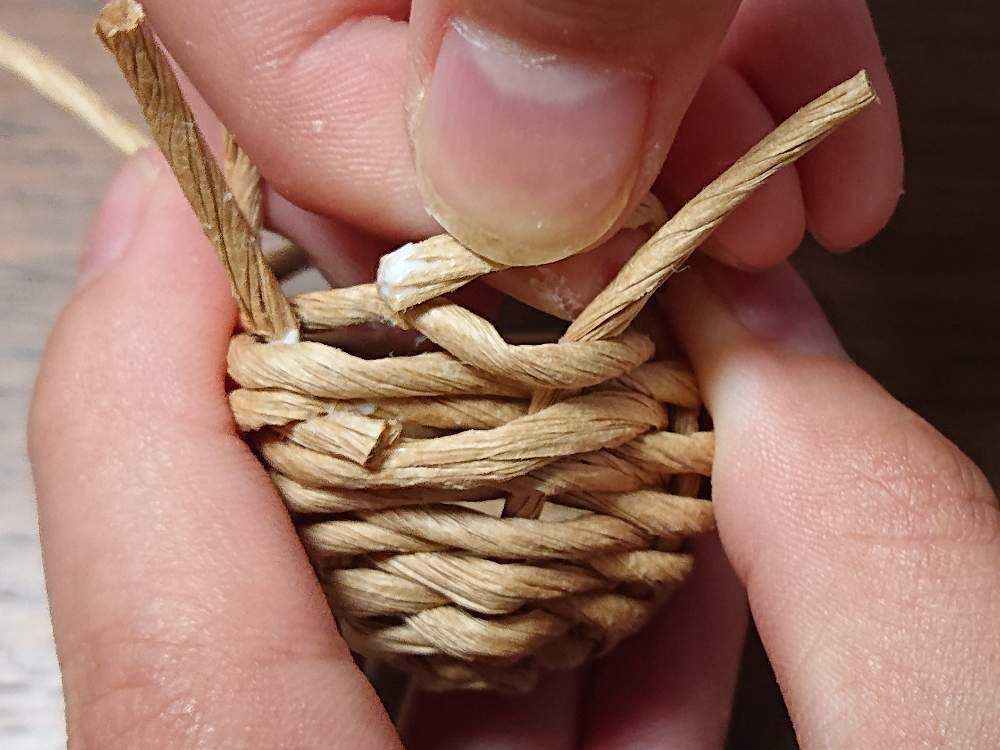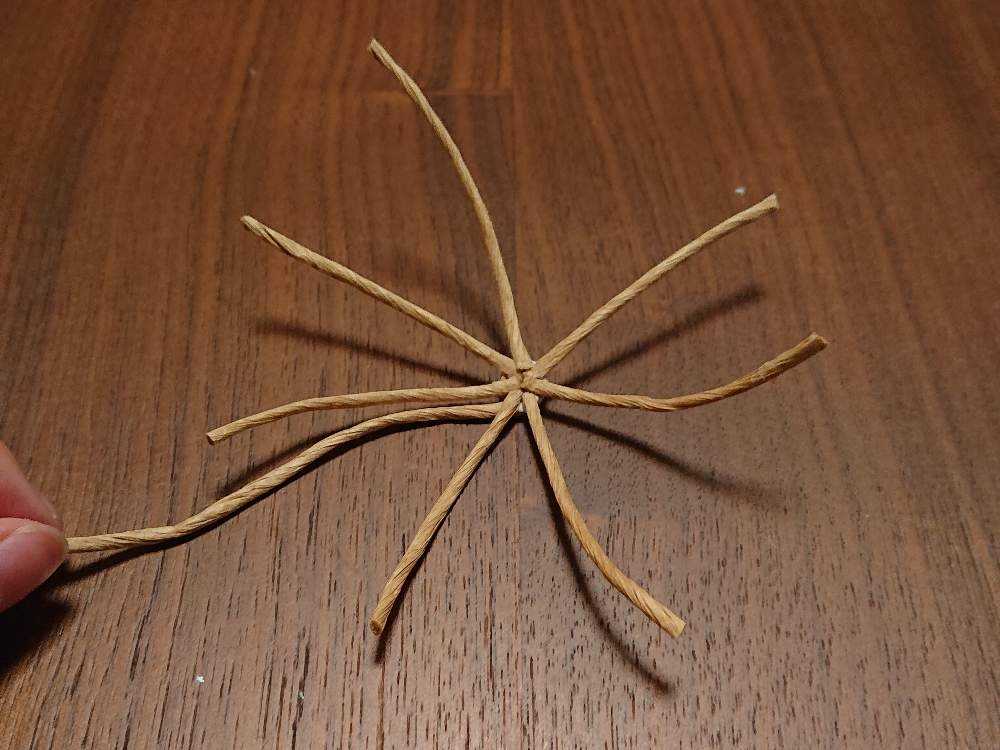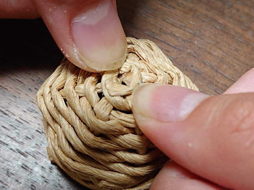 丸くした長い紙ヒモを7本の紙ヒモに、上下上下と、交互に巻いています。