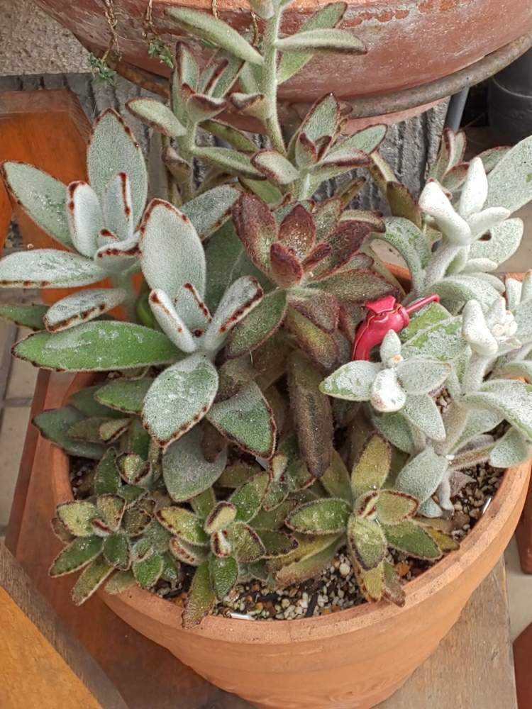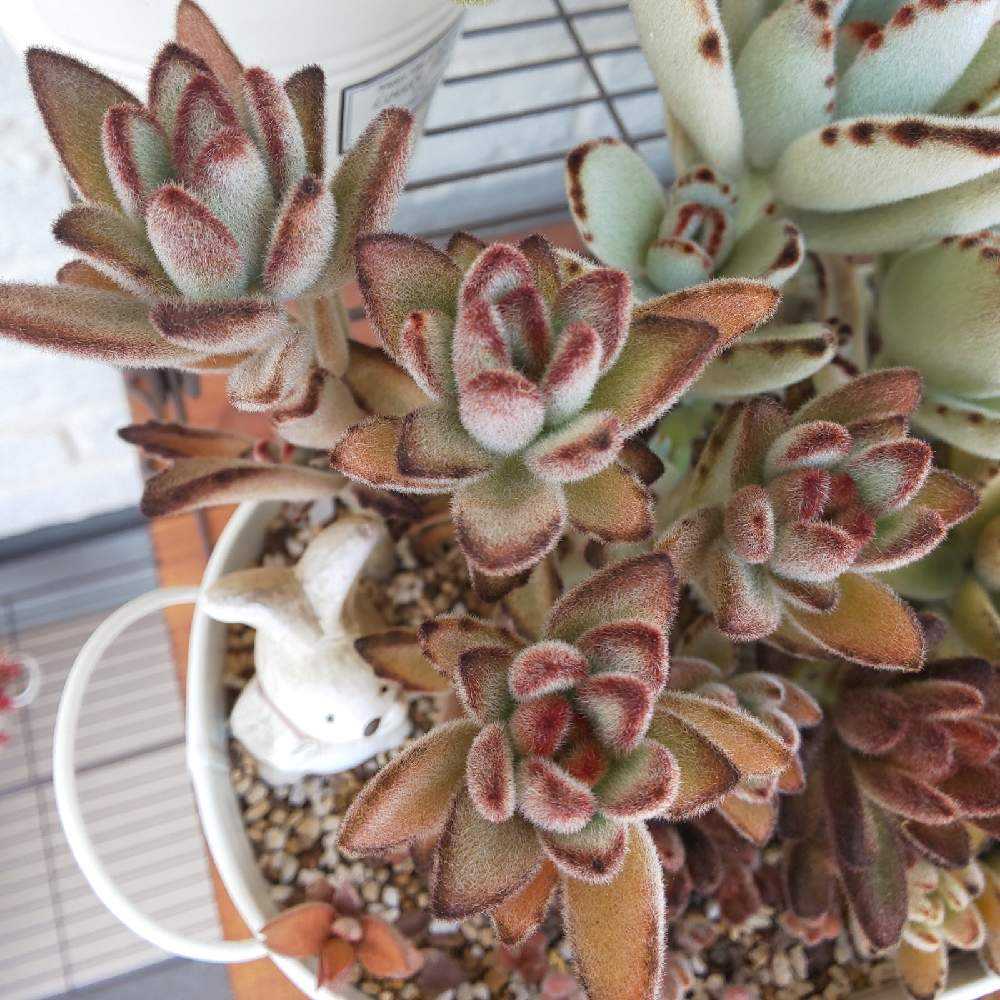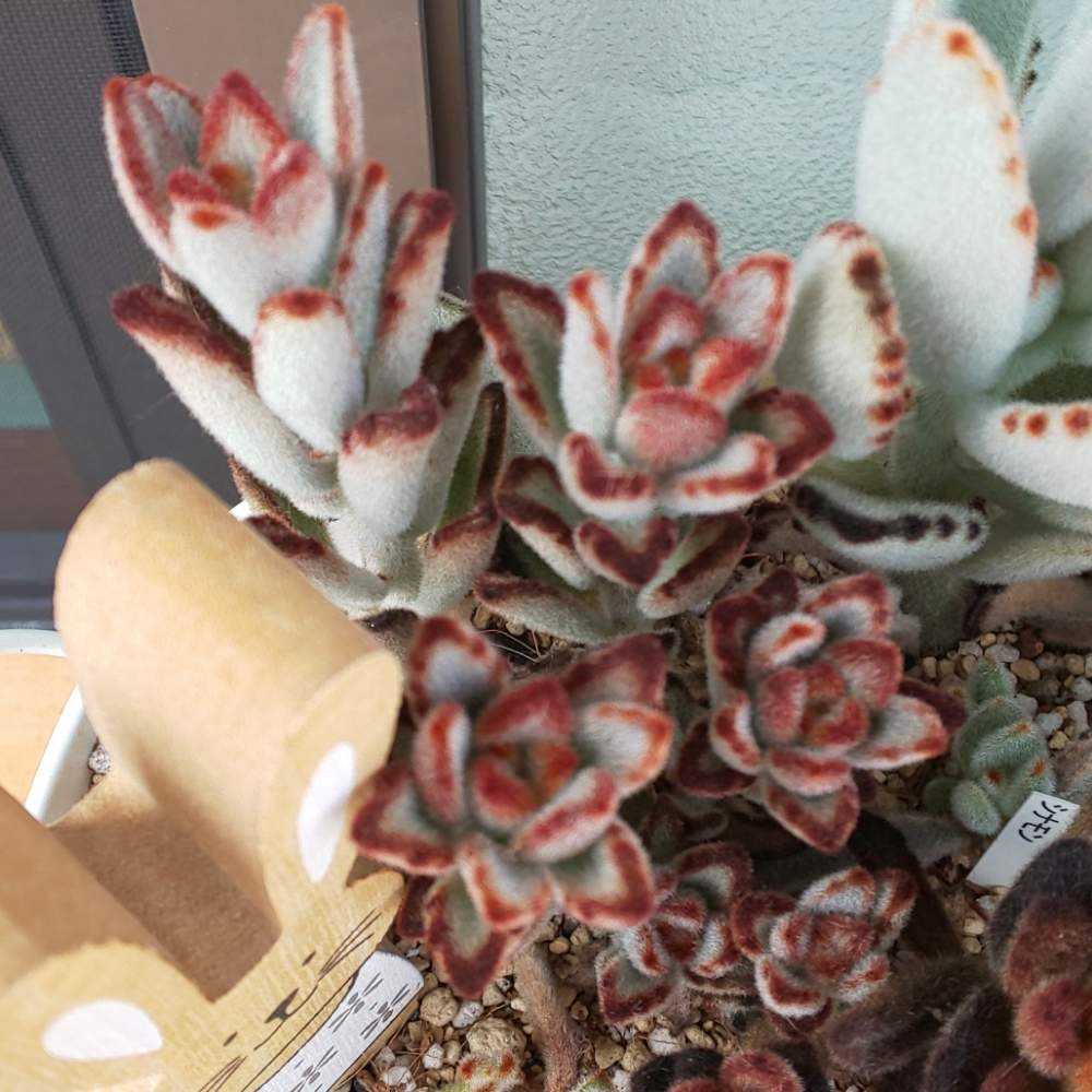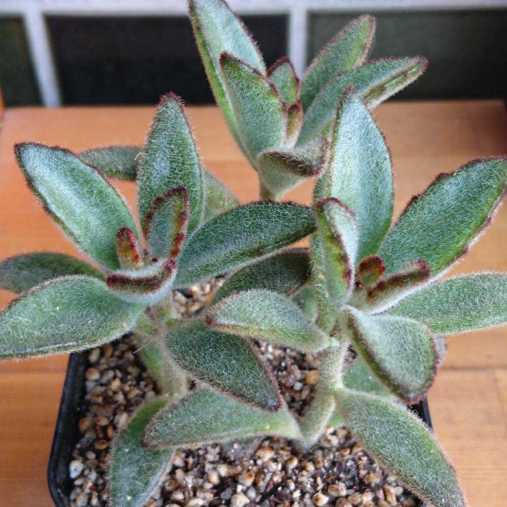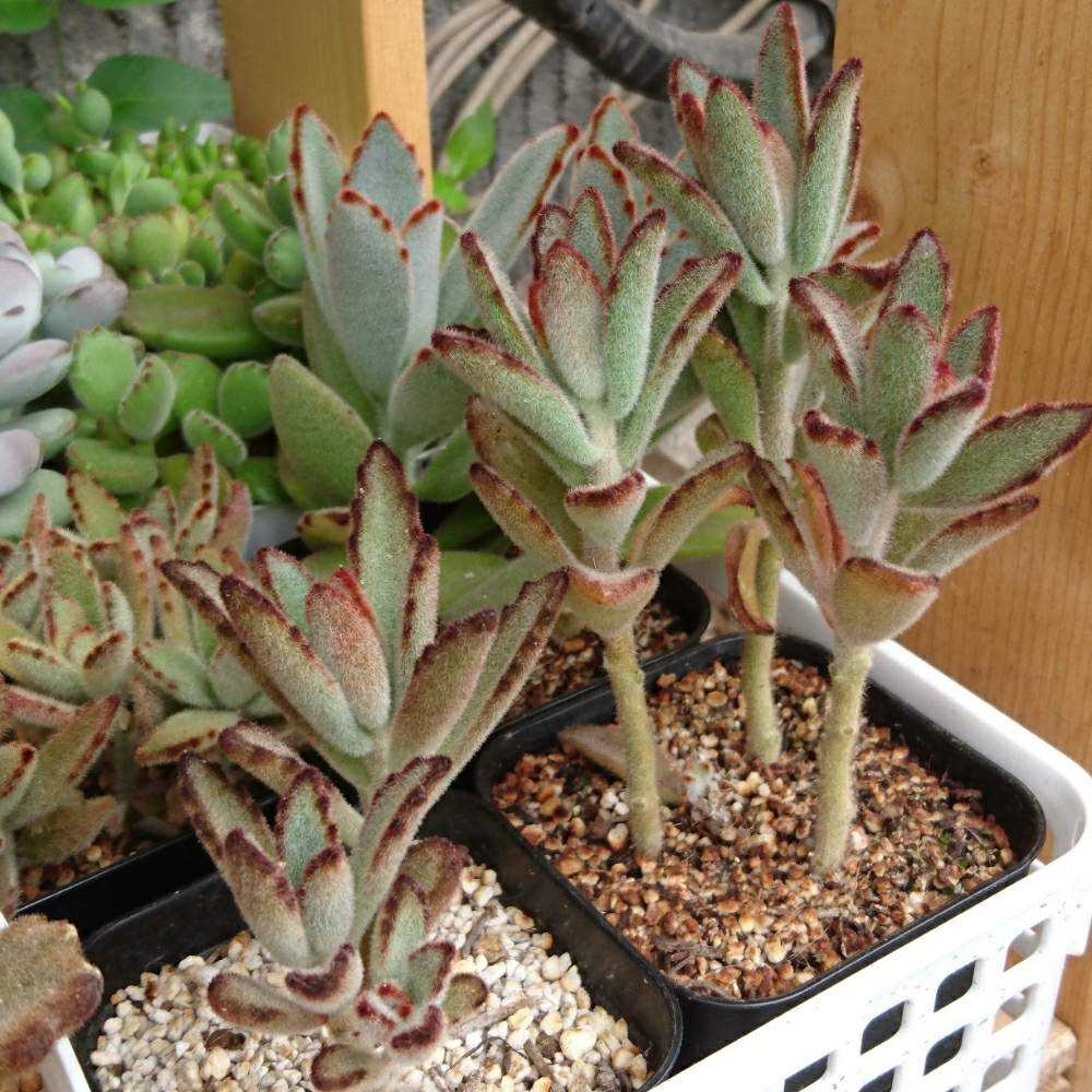 この子はまぁまぁ寒さに強そうだ。水を完全に断ち乾燥した状態でなら軒下の多肉棚で冬越しできる。しかし、葉が縮こまり落ちるので、夜帰宅時に室内に入れ、出勤前に軒下の南向き多肉棚の東列4段目に出す方法で冬越し。