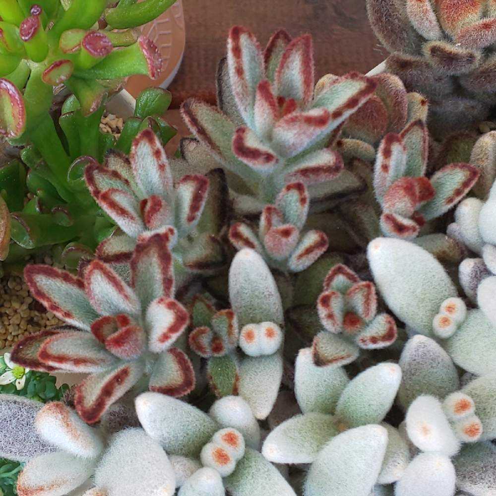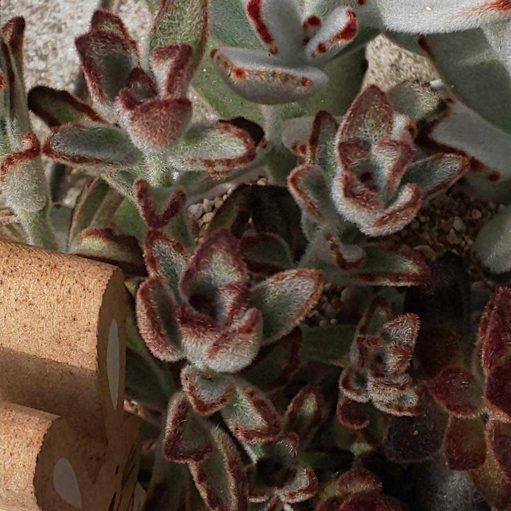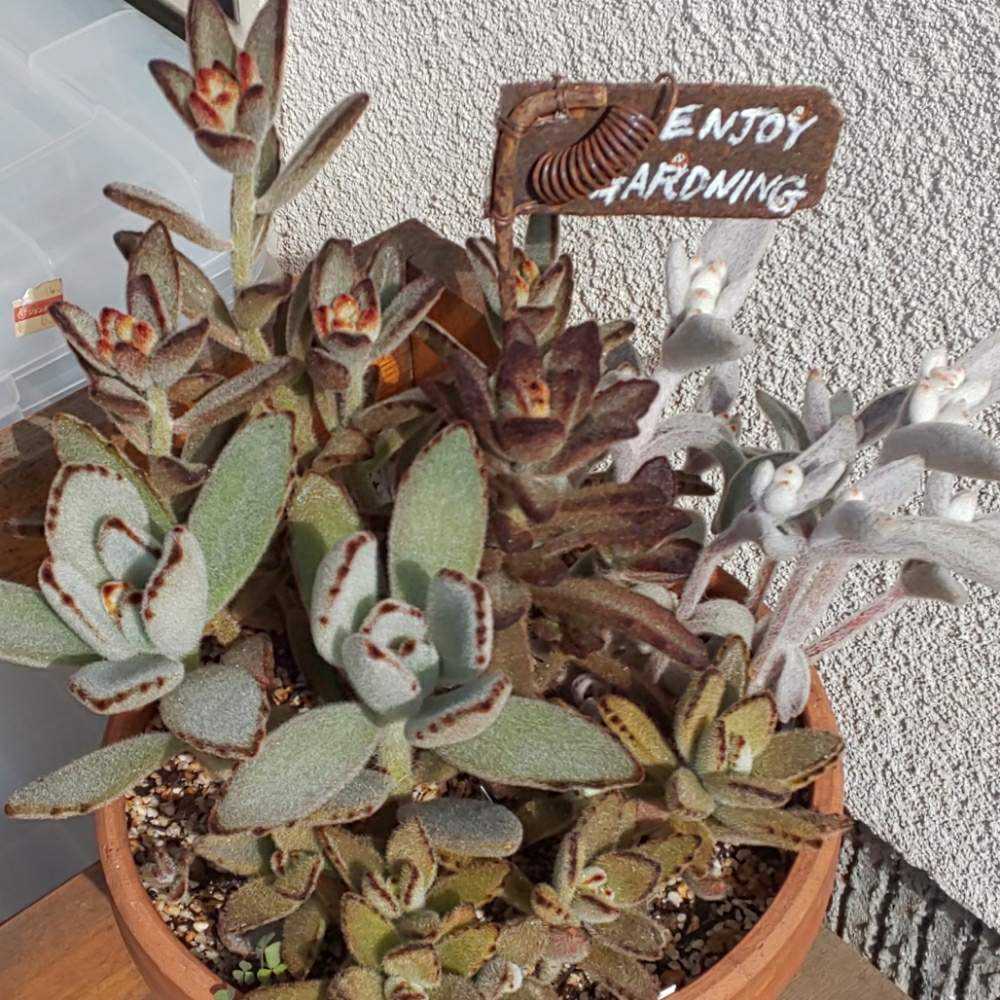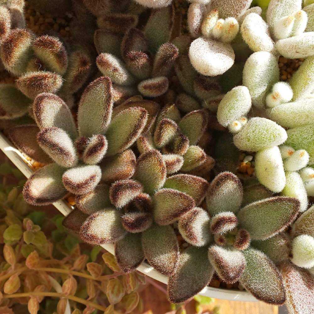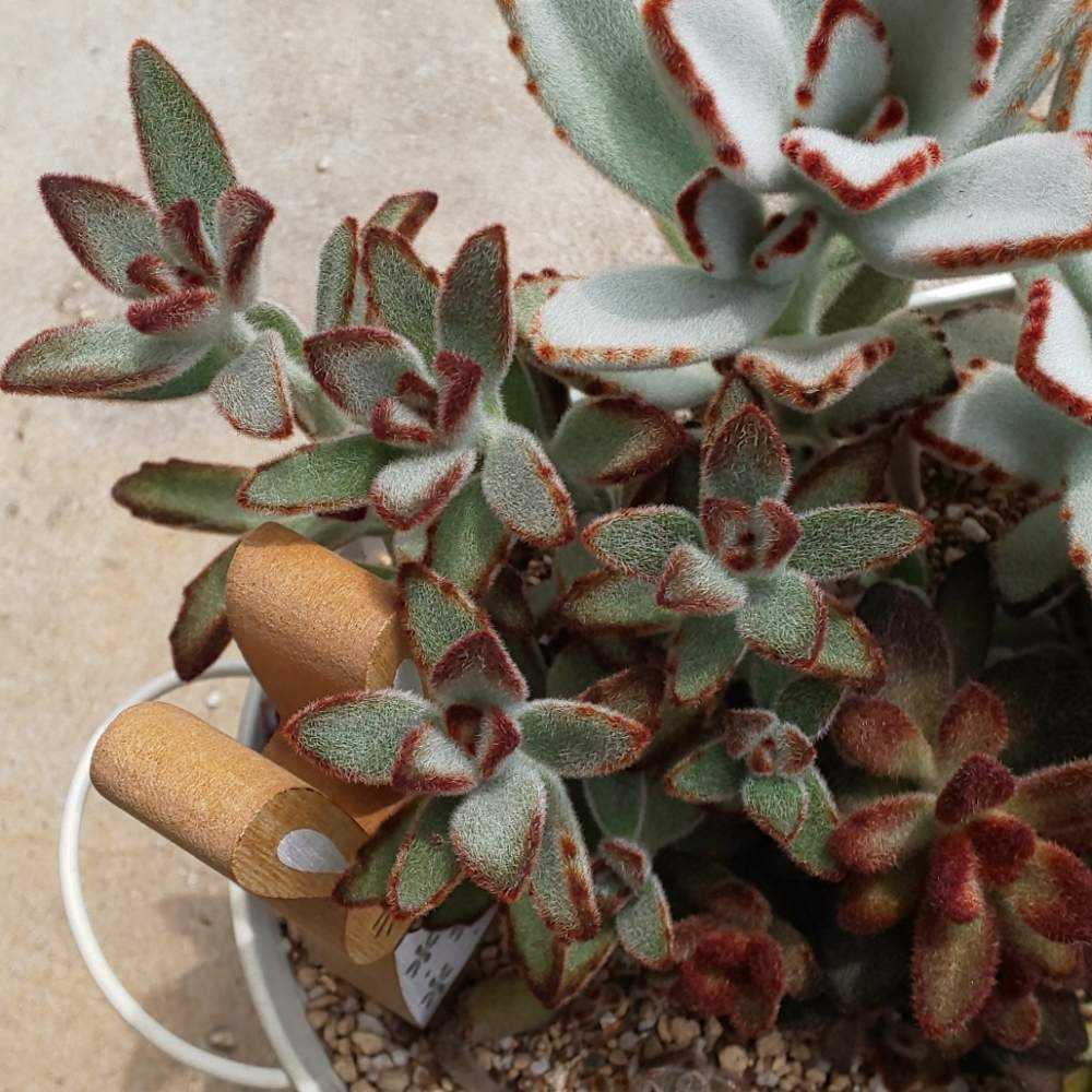 この子はまぁまぁ寒さに強そうだ。水を完全に断ち乾燥した状態でなら軒下の多肉棚で冬越しできる。しかし、葉が縮こまり落ちるので、夜帰宅時に室内に入れ、出勤前に軒下の南向き多肉棚の東列4段目に出す方法で冬越し。