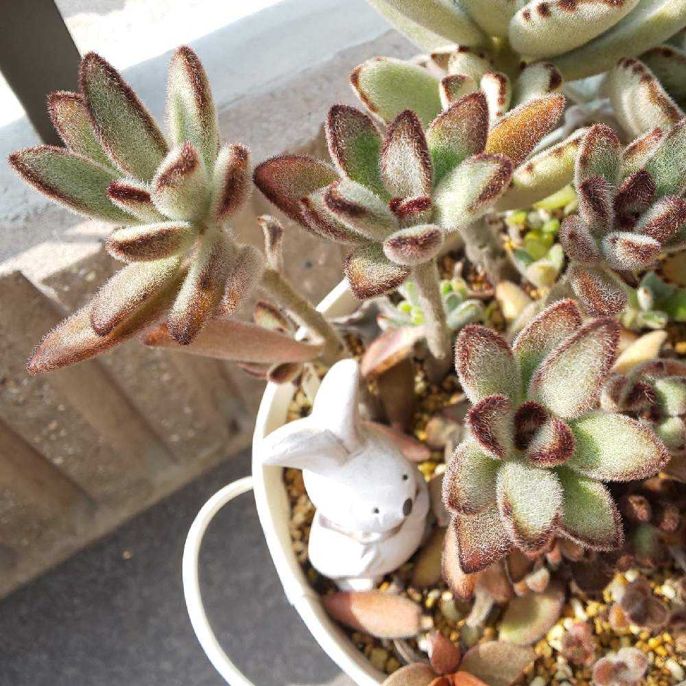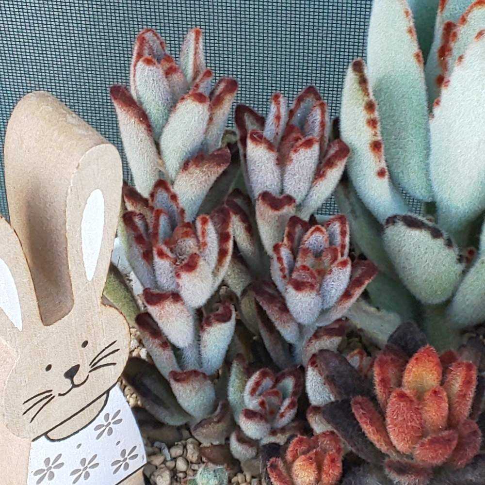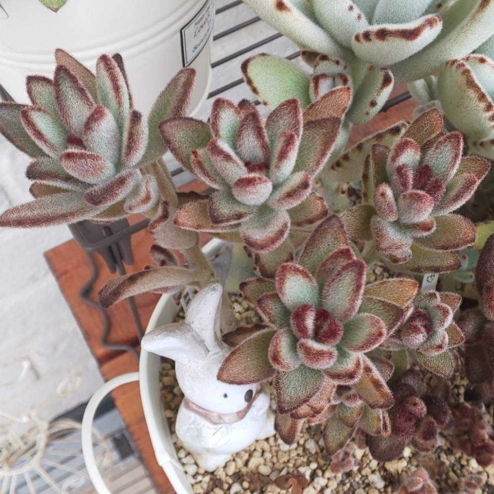 南側軒下の南向き多肉棚の上段で無対策の冬越し実験中。この鉢は兎丼で、メンバーに福兎耳が入っているので「大雪から夜だけ室内」に入れて冬越し中。ビニポットの子は対策無しの棚の下段に終日置いているが、先月7日からの寒波(両日の最低気温−3.6℃と−5.3℃)も全く問題なし。