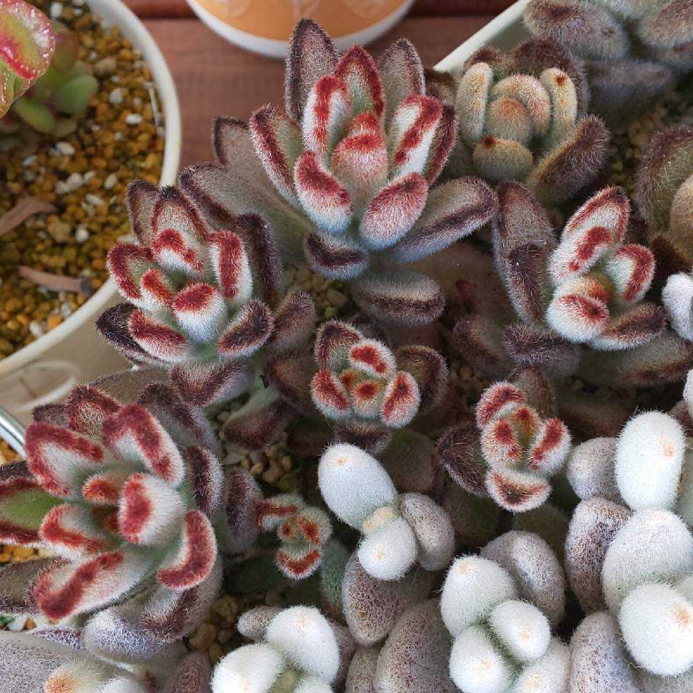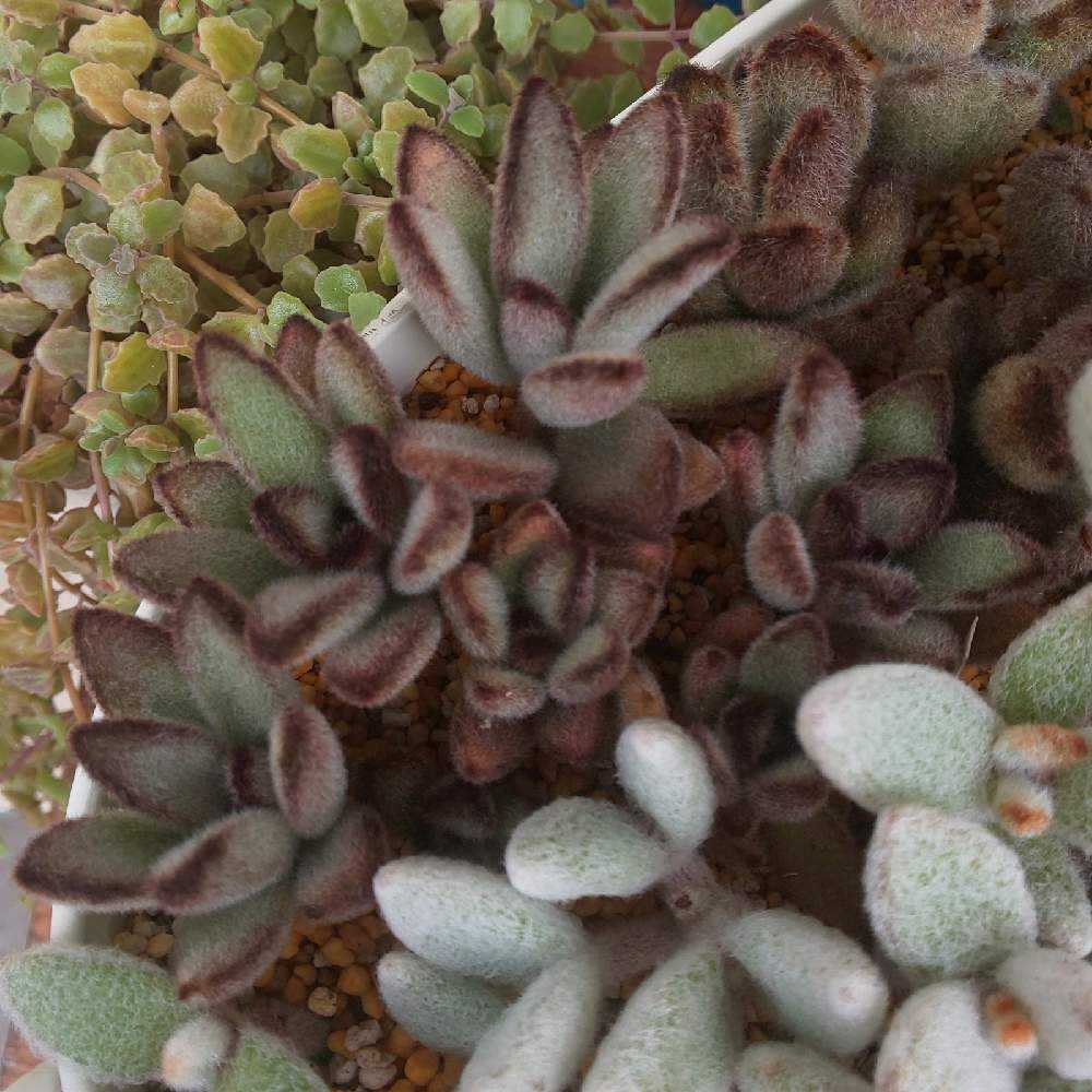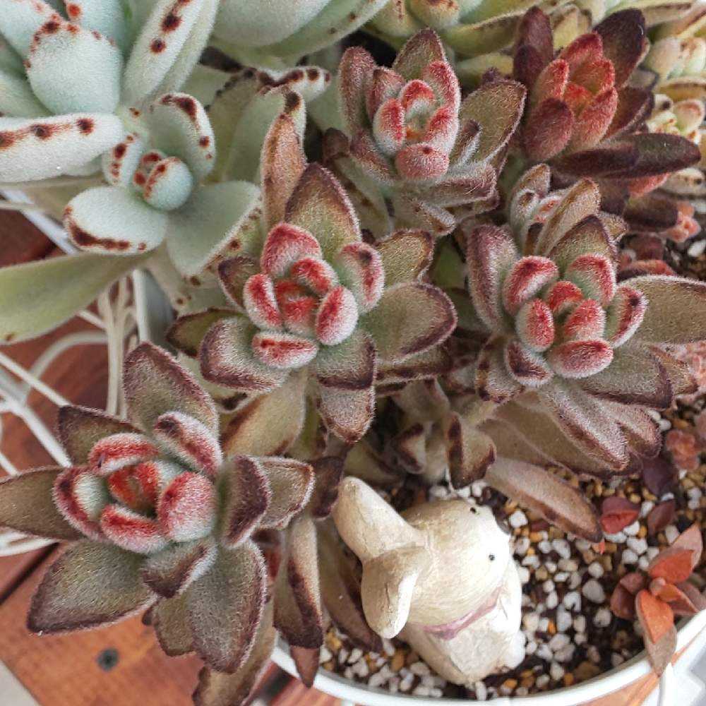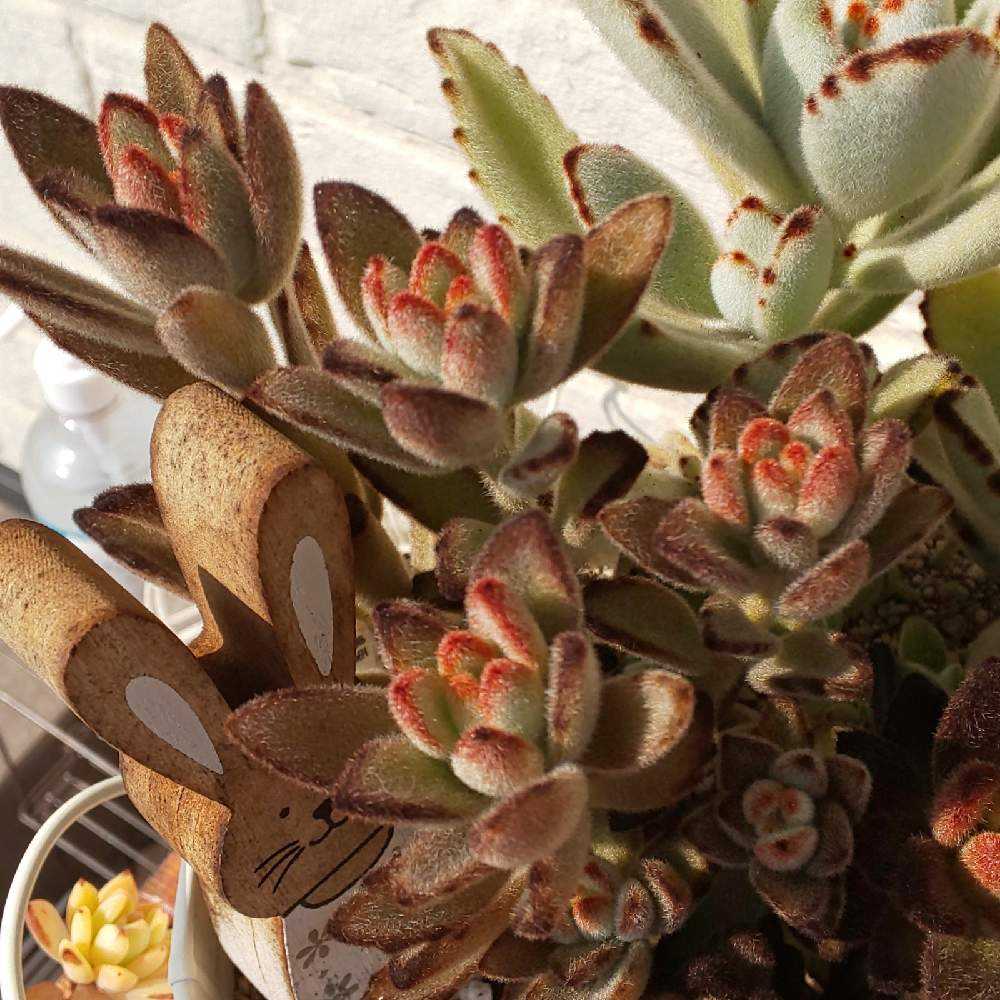 南側軒下の南向き多肉棚の上段で無対策の冬越し実験中。この鉢は兎丼で、メンバーに福兎耳が入っているので「大雪から夜だけ室内」に入れて冬越し中。ビニポットの子は対策無しの棚の下段に終日置いているが、先月7日からの寒波(両日の最低気温−3.6℃と−5.3℃)も全く問題なし。