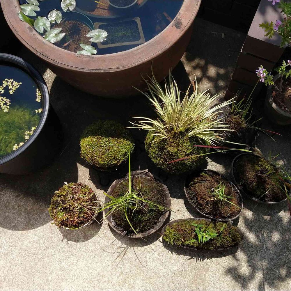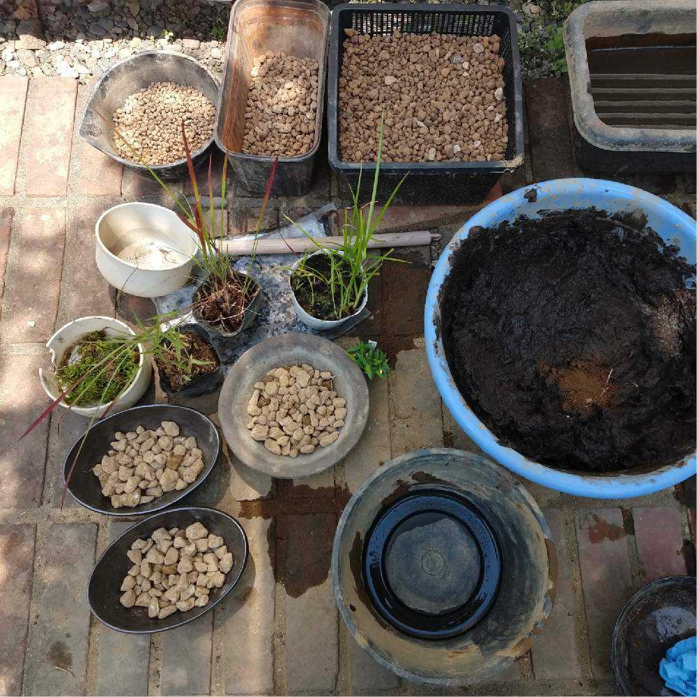 用土(ケト土と長繊維ピートモスを練ったもの)、穴の開いていない容器(100均の和食器が優秀)、鉢底石、根鉢を崩していない湿性植物(今回はベニチガヤ、トワダアシ、シラサギカヤツリ)、苔(ハイゴケ)を用意します。