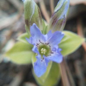 あっちの雑木林は動きがあるかな🚶 林の縁に溜まった落ち葉🍂を掻き分けてると 目が慣れてきて 草丈4~5cmほどの 「みずいろ」のフデリンドウを発見☺️ 🤸 🤸 🤸 🤸 🤸 🐛かじられてたけどね…