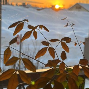 日の出 6時55分 ①② 窓辺のナンテン(南天) 昨年お正月の切花の種から植え たナンテン。 新芽(茶色)も出て元気です。 樹高 60cm ③日の出前 除雪した雪が屋根近くまで積み 上がっています。