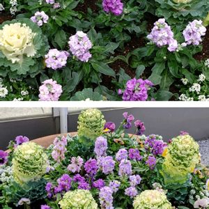 おはようございます。 ①上が一ヶ月前。ストックが咲いてハボタンが伸びてきました😂