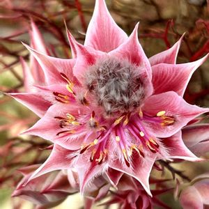 セルリア💖💝💞💓 ヤマモガシ科 セルリア属 原産国 南アフリカ🇿🇦 流通名 セルリア.フロリダ、ジョーイセルリア 花期は12〜4月で常緑低木 セルリア.フロリダはブラッシングブライド👰(頬を染めた花嫁)とも呼ばれ、故ダイアナ姫の結婚式のブーケ💐に使われた花だそうです 寒くなると色が濃くなる様です 乾燥に強く、外の多肉植物エリアに咲いています ピンクの色の花びらの様なものは苞で実際の花は内部 グレー🩶の綿毛になっていました ドライフラワーにすると余計に花が開く様です 花から蕾まで存在感のある花で大好きなお花です🌸 花言葉 可憐な心 秘めた愛 ほのかな思慕 優れた知識