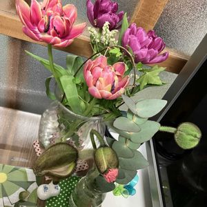雪割草ユキワリソウ 白いお花 マーガレット 生け花に生けてありました コウモリラン💚 ビカクシダ ビカクシダ