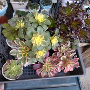 夜だけ玄関内に避難させているアエオニウム達☘️ トレーごと朝晩の移動で あまりじっくり観察する余裕がなかったけど‥💧 よく見たら夕映えに子株が沢山出ていました🥰 🏷️ 斑入り見つけ隊♪
