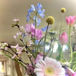 ケイオウザクラのつぼみが開き始めました🌸♪ (1番左の枝ものです) ピンクのスィートピー、チューリップ、黄色のクラスペディア、青いデルフィニュム‥ 部屋の中だけは一足早く春です 外の春も待ち遠しいですねぇ🍀