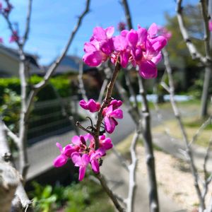 今日の いちまい🍀 ✣ハナズオウ✣ 昨年剪定をしたせいか 淋しい花つきになりましたが やっぱり可愛い😆 長寿桜も満開です💜🌿
