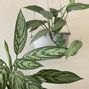 おはようございます エピプレムナムのツルがのびるので 吊るし鉢に植え替えました 地味めな鉢なのでカエルくんをくっつけてアグラオネマと記念撮影🤳 これから曇るそうですが 今は良い天気 やはり日曜日の試合に勝つと 気分の良い月曜日です⚾️