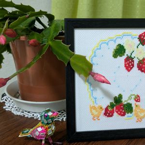 おはようございます😃 苺のクロスステッチ🪡完成👍 シャコバサボテンの蕾も大分膨らみました🩷