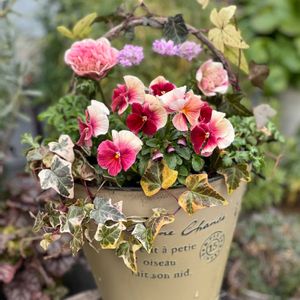 コメント無しで投稿してしまったので編集しました🙇♂️ 改めまして、こんにちは♪ 今日も寒さ全開🥶 雪もチラついているのでバラの虫対策の続きは断念して花屋を見てきました🚗 見れば手ぶらで帰宅は出来ませんよね😂 ①全体で📸 ②インパクトある色合いが気に入って即カゴに入れたのはうえたさんのビオラ、レインボーウェーブ・アプリコットローズビーコン🎶 ③大輪でアンティークピンクのアネモネmomo🩷 アルメリアのピンクボール💕 ④こちらもアンティークカラーでくすみピンクとベージュの複色。花は小ぶりだけどとっても可愛らしい雰囲気🥰 ⑤ちょっとアップで📸 今回は明るく春っぽい雰囲気を出したかったのでイエローの鉢をチョイス😊 ※今回のポイントはヘデラの立体感を出すために枯れ枝(剪定枝は全部捨ててしまったので剪定後のセイヨウニンジンボクの枝をさらに✂️)を曲げてアーチ状の支柱にして巻いたところかな👍 今月も宜しくお願いします♡