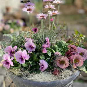こんにちは^ ^ 午前園芸店に行って プリムラジュリアン ビオラ リーフを買ってきて ローダンセマムと寄せました🌸🍃 ピンクの寄せ植えですが、ちょっと落ち着いたピンクを選んでみました🩷 大人可愛い寄せ植えに なったかなぁ♡^ ^♡♪ 初めてツンツンしたリーフを使ってみましたが、なかなか難しいです😅 最後はおまけ。 3歳の孫がら紫のバッグを作ってと言われて作りました💜