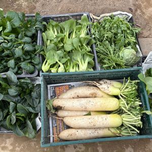 おはようございます😊 今日は昨日収穫した野菜🥦🥬 さん😊 ほうれん草,,雪菜,,チンゲン菜 春菊,,キャベツ,,大根,,水菜 沢山収穫しました〜🎶😊