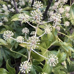 円錐形に咲くヤツデ(八つ手)の花は 地味に見えますが よく見るととっても綺麗です。 葉っぱは深い切れ込みがあり 人の手のように見えることから "大きな手でお客を招く"と言う意味合いで 古くからお店の入り口などに植えられた縁起物の植物です。 また 大きな葉が邪気の侵入を防ぐことで 魔除け 病除けとしても重宝してきたようです。🤗✨ 日本原産。 ウコギ科ヤツデ属の常緑低木。