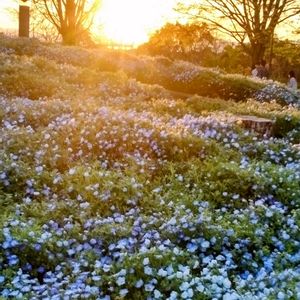 真っ赤な夕陽🌇 美しいネモフィラ💠が 周りのサクラ🌸も 夕陽🌇を受けて… 輝いて✨✨✨素晴らしい‼️ マジックアワーは魅力が一杯…🧚💞🥰 (*゜ー゜)ゞ⌒☆\(^_^)/(゜▽゜*)