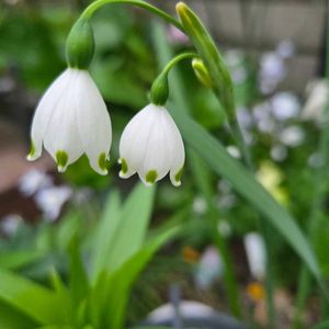 今日のお花 スノーフレークは スイセンのようにスラっとした葉っぱで スズランのような可愛いベル型の花を下向きに咲かせます。 花弁の先端にフリフリのフリルと緑の斑点があるのが特徴です。 花後は 地上部は枯れて休眠に入りますが 1年中植えっぱなしでも毎年春になると綺麗に花を咲かせます。 とっても可愛くって手間いらずのお花です。🤗✨ ヨーロッパ中部 地中海沿岸原産。 ヒガンバナ科スノーフレーク属 多年草