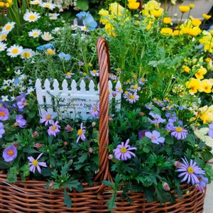 こんにちわ〜🌛✨ バスケット🧺の中に 小花を集めた春の寄せ植え🩵🩷💜✨ ①プラキカムブルージャズ×2株 ②ステラコンパクトローザ(jardinハルディン)×2株 ③バックにネモフィラ ネモフィラの開花がポツリポツリ…×2株 これからが楽しみです🎶🤩