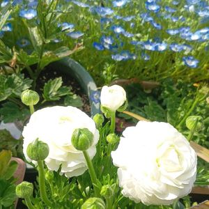 🍀おはようございます🍀 10月半ばに植えつけた 何年も経っているラナンキュラス🤍 真っ白いお花が大のお気に入り💞 たくさん蕾をつけています🎶 種蒔きネモフィラと… ③チューリップ🌷 今年は少ないです😅 例年と同じように掘り上げて 保存していましたが 昨年のあの酷暑で球根がダメに💦 少しだけですが咲き始めました ④フジバカマの新芽🌱が 出揃ってきました🌿 ⑤フリージアの良い香りを 楽しんでいます🎶