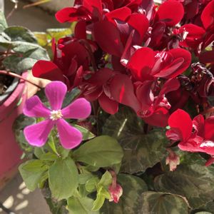 シクラメンのギュウギュウな鉢に零れ種ピンクパンサーが一輪