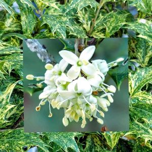 おはようございます🧓 寒いながらも明るい陽射しに春の兆しが感じられる朝です✨☀️ 今日のお花“ヒイラギ”❣️ 我が家のヒイラギはゴシキヒイラギ(五色柊)…クリーム色の斑が入った美しい葉っぱが特徴です🌿💛🌿 一昨年には真っ白い小さなお花が咲いたのですが…昨年は全く咲きませんでした😆 真ん中のお花はお散歩中…公園に咲いていたお花です🤍 キンモクセイに似たような甘い香りに純白の小さなお花が集まって…可愛いらしいですネ🥰 今日も穏やかな良い一日でありますように…✨(*˘︶˘*)🍀