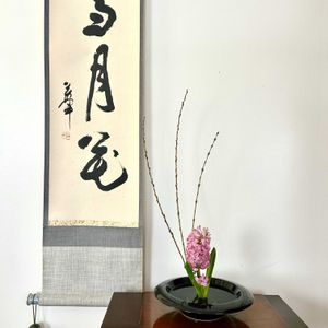 今週もよろしくお願いします。 〜春待つ思い 花器: 日本製耐熱ガラスの器 花材: ヒヤシンス、行李柳