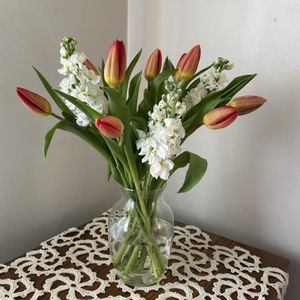 イースターなので、ダーリンの実家へ2泊3日で行きます。 1、この春のブーケ持っていきます 花器:🇺🇸製ガラスの平凡な花瓶 花材: チューリップ、ストック、ナツシロギク 2、わが家のイースターバニーさん 3、増水がすごいサスケハナ川