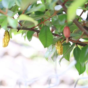 オオゴマダラの蛹‼️ 庭に有るグミ、そろそろ熟 したかな?と覗いたら❗️ 何とオオゴマダラの蛹が グミの実と並んで ぶら下がってる‼️ 実と蛹が同じ雰囲気だ❣️ オオゴマダラの食草の ホウライカガミが側に有り 近くのこの場所が羽化までの 安全な住処と見たか👀❓ 見えないけど裏がわにも付いて いて4つグミの木だけに 付いている🥇🥇🥇 羽化の瞬間まで見守りたい(*´︶`*)ノ